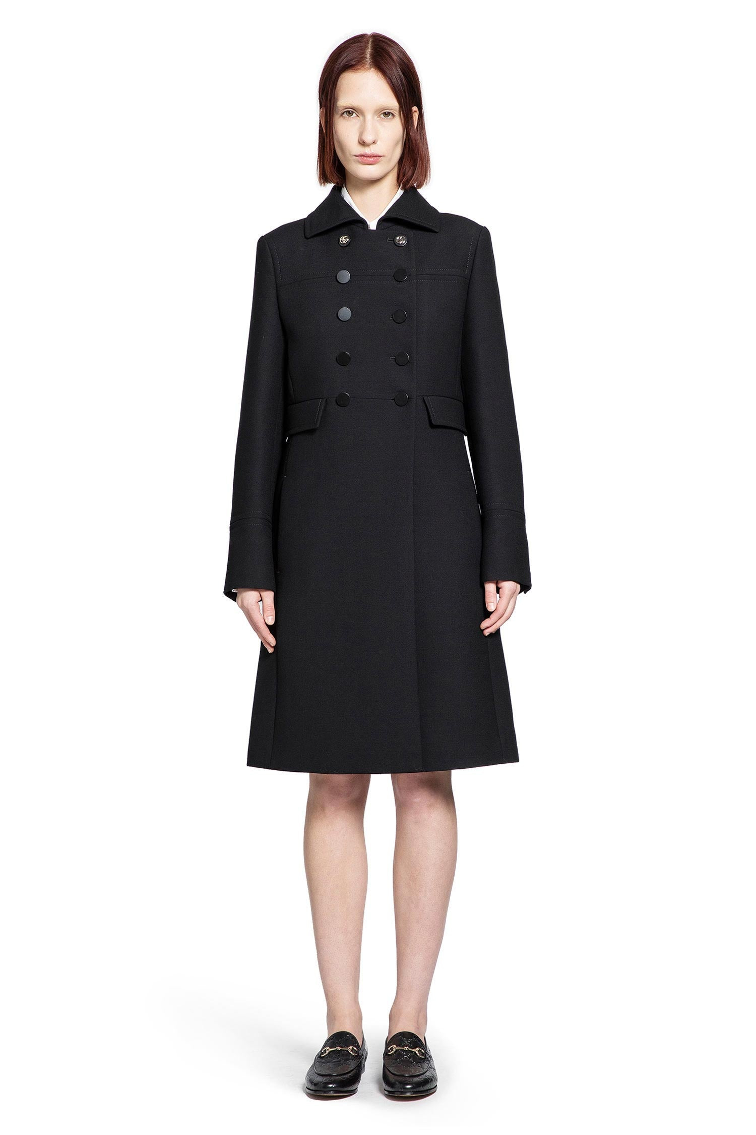 DESCRIPTION - Blackwool feltcollardouble-breastedbutton closureside flap pocketsbuttoned cuffsback splitsightly flared cut DETAILS - Made in: Italy - Composition: 100% Wool - Model code: 823841Z7ASS 1000 - Item ID: 9768000880982