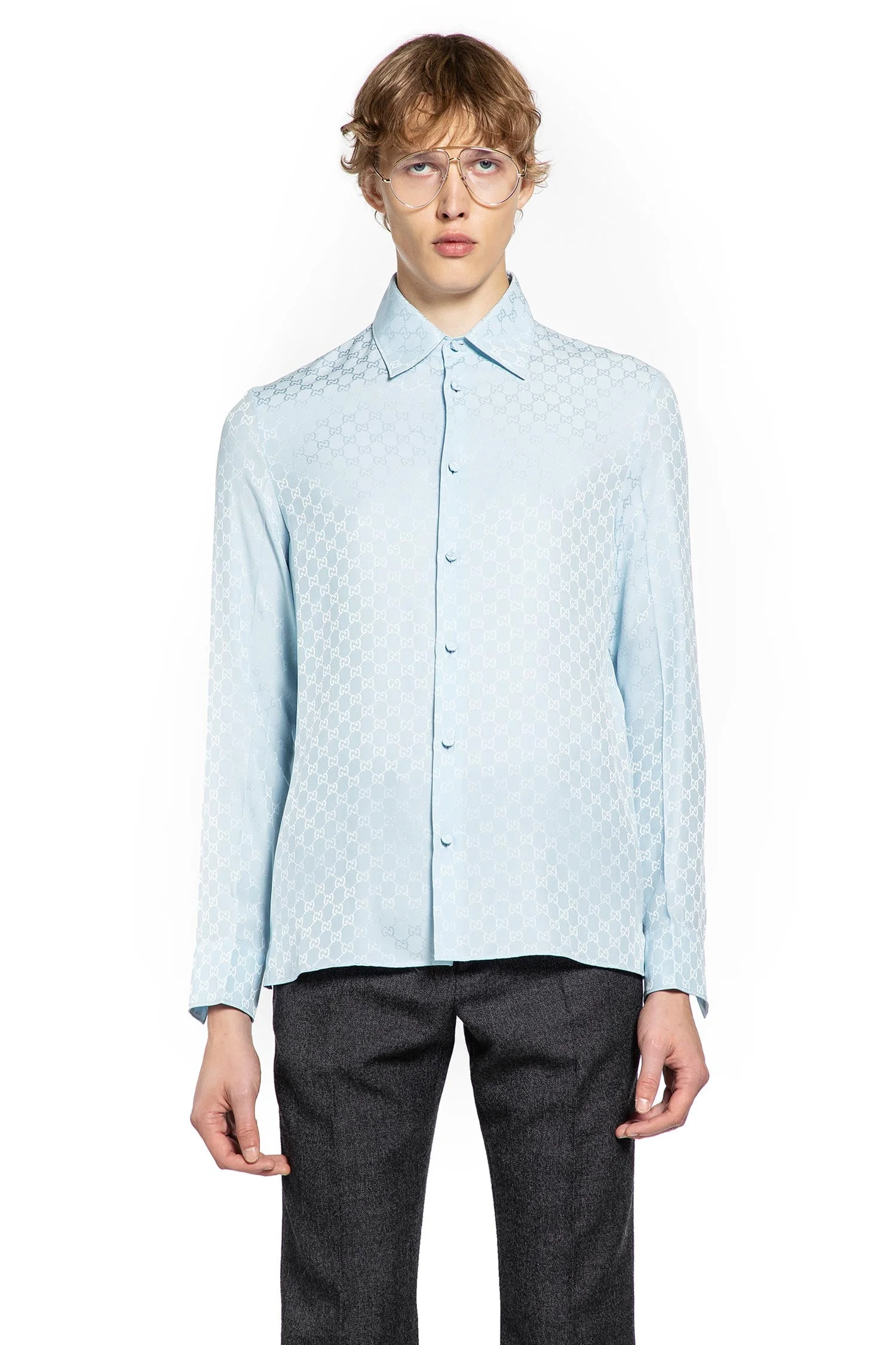 DESCRIPTION - Gucci s signature elegance is reinterpreted in this fitted GG jacquard silk shirt. Defined by a sleek pointed collar and buttoned cuffs, it blends timeless tailoring with a luxurious texture. Perfect for elevating both formal and contemporary looks with unmistakable sophistication. - Light blue - GG jacquard silk - Button closure DETAILS - Made in: Italy - Composition: 100% Silk - Model code: 847034ZATF9 4977 - Item ID: 9918389223766