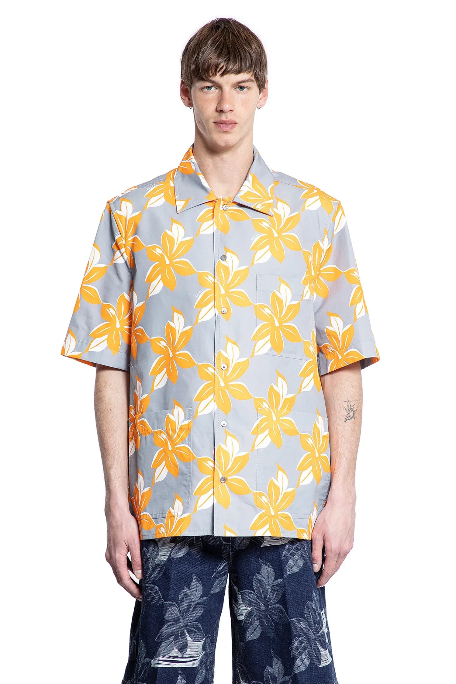 DESCRIPTION - Runway style - Multicolor - Grey/orange - Cotton poplin - Flower print - Notched collar - Button closure - Chest pocket - Dropped shoulders - Short sleeves DETAILS - Made in: Italy - Composition: 100% Cotton - Model code: 821498Z7AM0 1061 - Item ID: 9521886265686 SIZE & FIT Model wears size 48 Model Height 189 cm Chest 88 cm Waist 69 cm Hips 88 cm