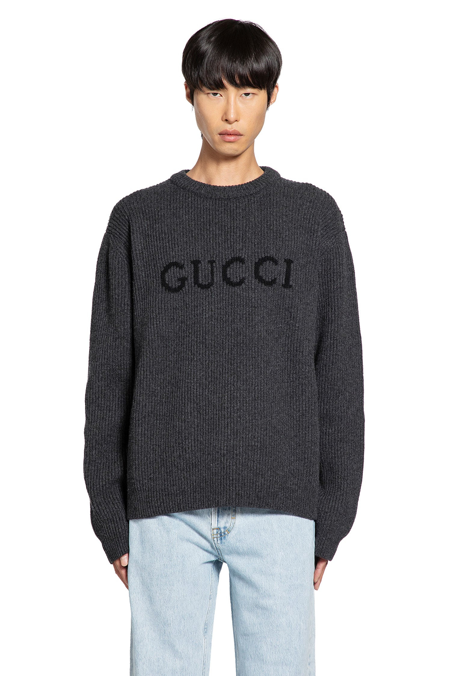 DESCRIPTION - Black - Wool cashmere knit - Crewneck - Front logo jacquard - Dropped shoulders - Ribbed hem and cuffs - Relaxed fit DETAILS - Made in: Italy - Composition: 70% Virgin Wool 30% Cashmere - Model code: 833499XKEYJ 1043 - Item ID: 9769628860758 SIZE & FIT Model wears size M Model Height 188 cm Chest 88 cm Waist 69 cm Hips 88 cm