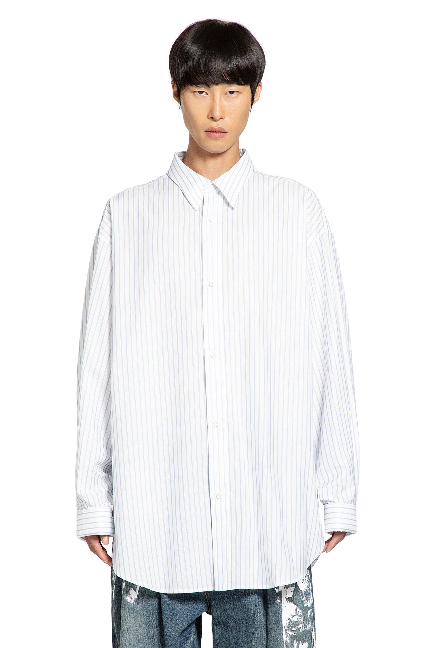 DESCRIPTION - Runway style - Multicolor - Natural/blue - Pinstriped cotton poplin - Classic collar - Button closure - Dropped shoulders - Long sleeves - Buttoned cuffs - Back box pleat - Curved hem - Oversized fit DETAILS - Made in: Italy - Composition: 100% Cotton - Model code: HMMB60001AHB049 104 - Item ID: 9769629909334 SIZE & FIT Model wears size S Model Height 188 cm Chest 88 cm Waist 69 cm Hips 88 cm