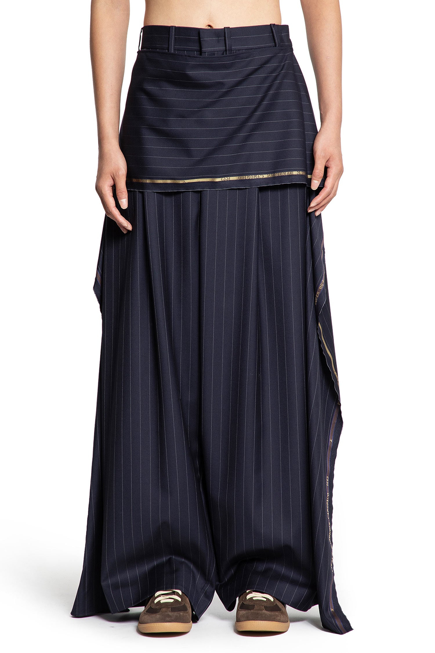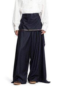 DESCRIPTION - Blue - Pinstriped - High-waisted - Belt holes - Hook and zip closure - Front layered panel - Wide leg - Floor length - Draped DETAILS - Made in: Italy - Composition: 100% Virgin Wool - Model code: HMMB30039AHB217 410 - Item ID: 9740839420246 SIZE & FIT Model wears size XS Model Height 188 cm Bust 88 cm Waist 69 cm Hips 88 cm
