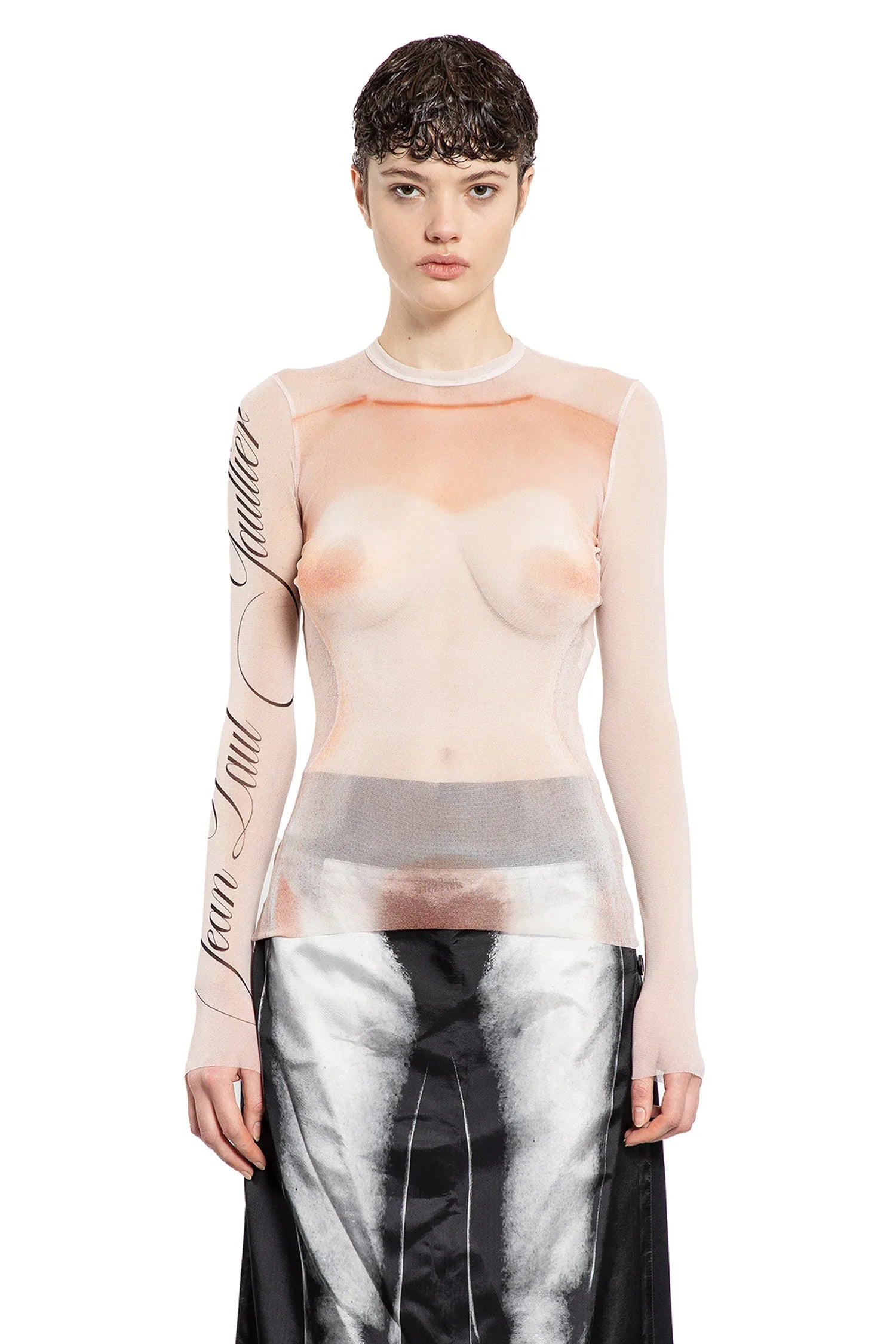 DESCRIPTION - Pink - ''Le Classique'' logo print - Sheer nylon tulle - Round neck - Long sleeves - Fitted DETAILS - Made in: Italy - Composition: 100% Polyamide - Model code: 2533FTO258T577 2026 - Item ID: 9316666900822 SIZE & FIT Model wears size S Model Height 178 cm Bust 85 cm Waist 73 cm Hips 92 cm