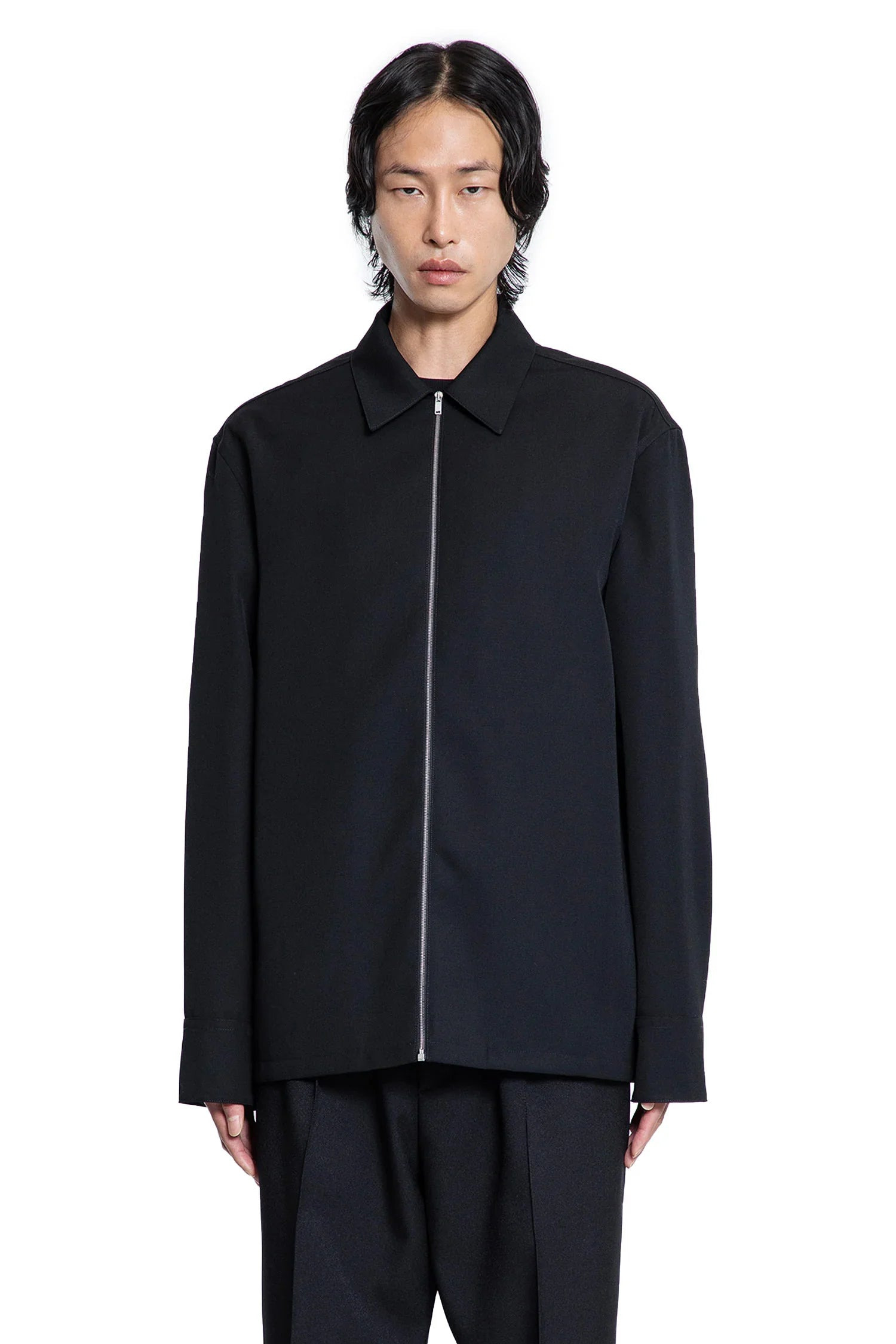 DESCRIPTION - Black - Wool twill - Collar - Zip closure - Dropped shoulders - Long sleeves - Buttoned cuffs - Straight hem DETAILS - Made in: Italy - Composition: 100% Wool - Model code: J22DL0249J40002 001 - Item ID: 9636170334550 SIZE & FIT Model wears size 46 Model Height 188 cm Chest 88 cm Waist 69 cm Hips 86 cm