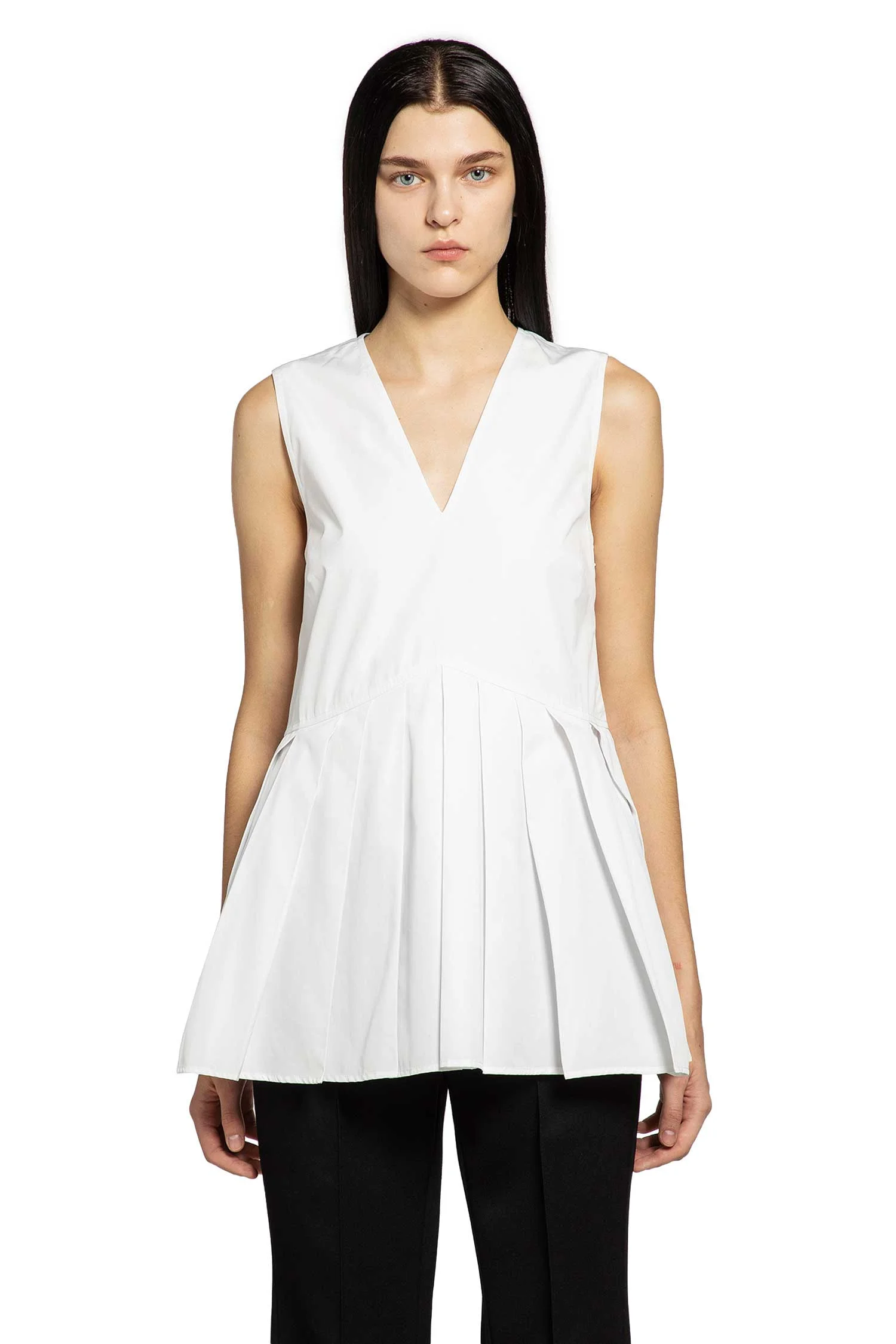DESCRIPTION - The Top 130 PL in white reimagines minimalism with subtle movement. Cotton poplin holds a crisp V-neck while the pleated hem and flared cut introduce a quiet tension, turning a simple silhouette into a study in disciplined form and refined proportions. - White - Cotton poplin - V-neck - Pleated hem - Flared cut DETAILS - Made in: Italy - Composition: 100% Cotton - Model code: J01NC0178 100 - Item ID: 9988695523670