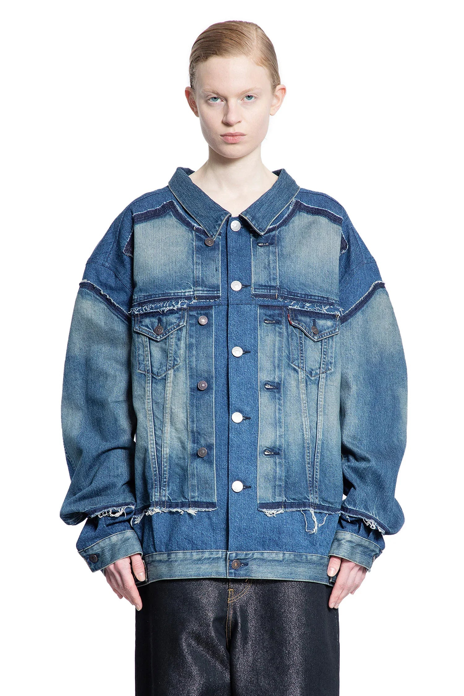 DESCRIPTION - Runway style - Blue - Spliced washed denim - Frayed raw-edge details - Collar - Button closure - Button flap chest pockets - Dropped shoulders - Buttoned cuffs - Back buttoned waist tabs - Oversized fit DETAILS - Made in: Japan - Composition: 100% Cotton - Model code: JOJ202S25 1 - Item ID: 9498220790102