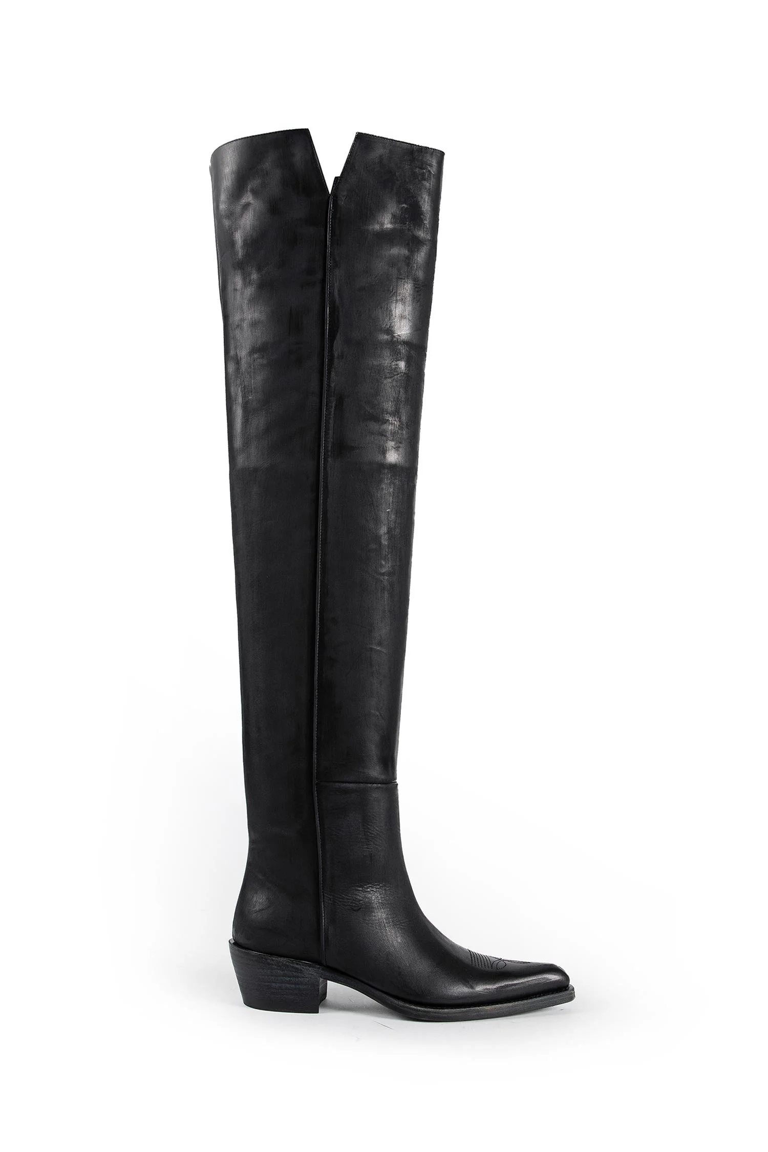 DESCRIPTION - Khaite turns the American boot into a future object:iconography distilled, authority amplified, elegance with a frontier edge. - Runway style - Black - Buttery vacchetta leather - Side splits - Front western stitching details - Leather sole - Block heel - Goatskin lining - Over-the-knee height DETAILS - Made in: Italy - Composition: 100% Calfskin - Model code: F1114945 200 - Item ID: 9941400191318