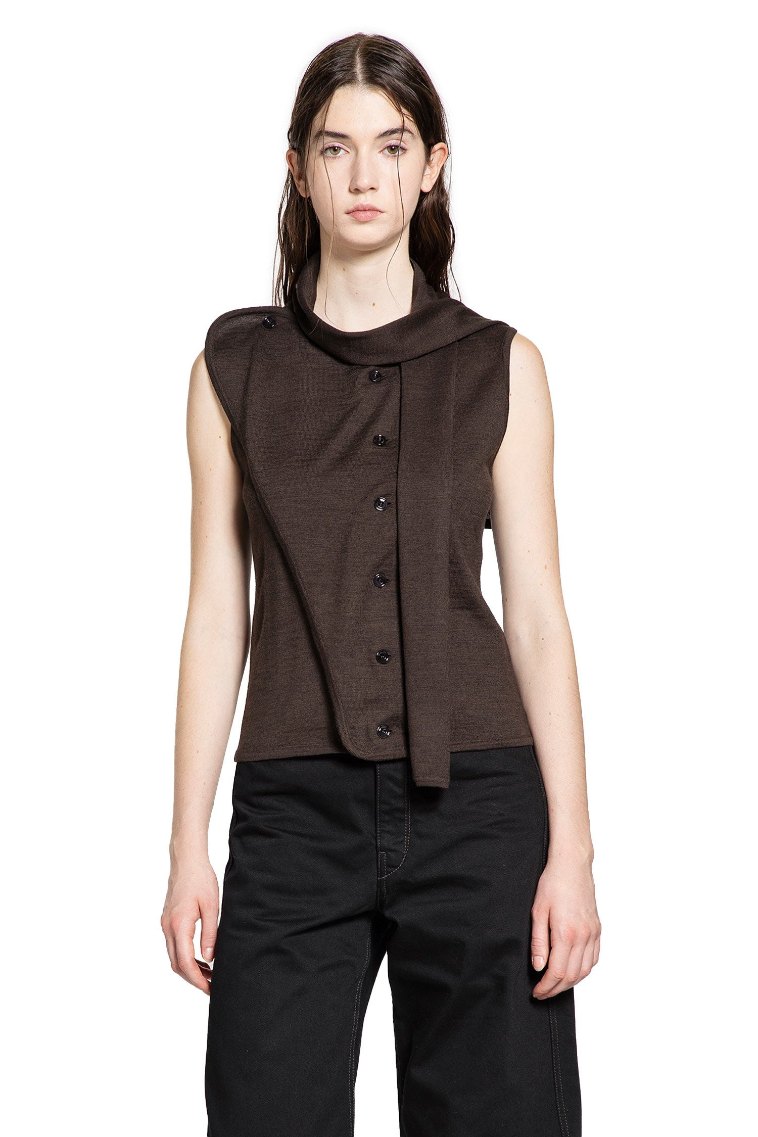 DESCRIPTION - Dark cacao - Merino wool blend - Round neck - Self-tie scarf panel - Button closure - Sleeveless - Slim fit DETAILS - Made in: Portugal - Composition: 50% Acrylic 50% Wool - Model code: TO1485LK087 BR397 - Item ID: 9871467118934