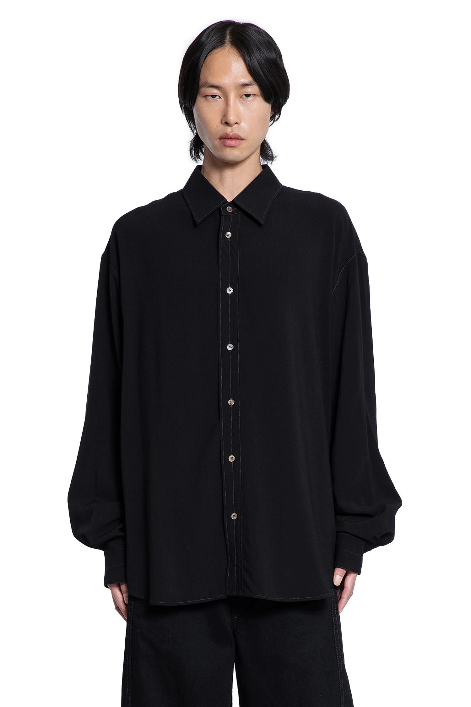 DESCRIPTION - Black - Classic collar - Button closure - Dropped shoulders - Long sleeves - Buttoned cuffs - Back box pleat - Curved hem - Loose fit DETAILS - Composition: 85% Viscose 15% Virgin Wool - Model code: SH1206LF1286 BK997 - Item ID: 9842075631958