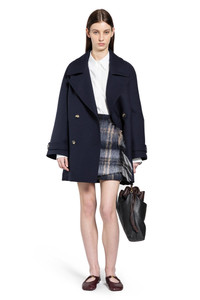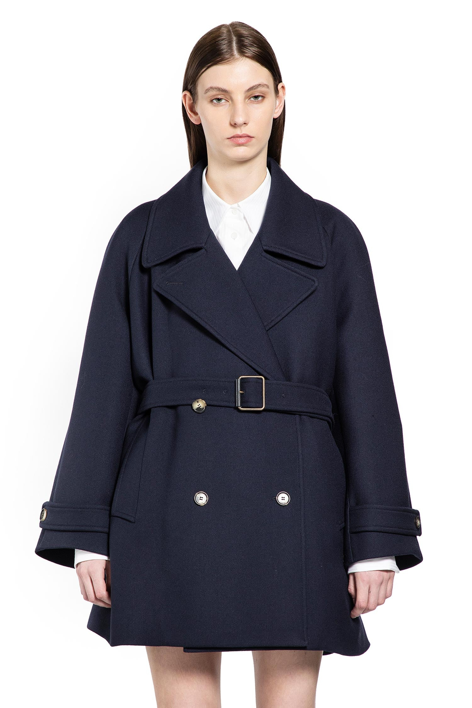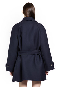 DESCRIPTION - Navy blue - Medium-weight double face wool blend drill - Notched collar - Double-breasted - Button closure - Adjustable and removable belt - Side pockets - Raglan sleeves - Buttoned cuff tabs - Relaxed fit DETAILS - Made in: Italy - Composition: 99% Wool 1% Silk - Model code: S540Y01XBE 5110 - Item ID: 9891591356758