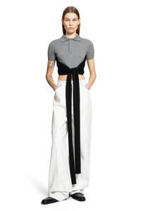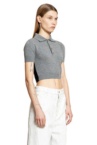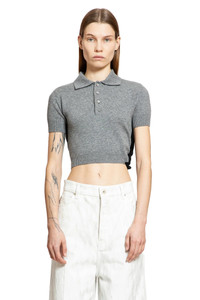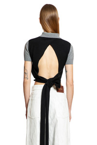 DESCRIPTION - Runway style - Grey - Wool cashmere knit - Collar - Quarter-button closure - Dropped shoulders - Short sleeves - Open back - Self-tie hem - Cropped hem - Fitted DETAILS - Made in: Italy - Composition: 80% Virgin Wool 20% Cashmere - Model code: S540Y55K26 1121 - Item ID: 9404217950550