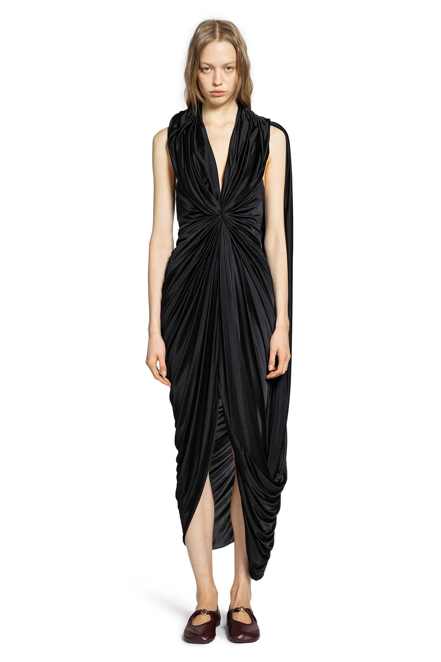DESCRIPTION - Loewe turns eveningwear into a sculpted gesture.Glossy viscose satin is pulled, knotted, and gathered through the front, a controlled disruption that shapes the body with subtle tension. A scarf-like panel slips into the V-neck and trails into an asymmetric hem, while the open back keeps the silhouette sharp and exposed. Elegant, but undeniably experimental. - Black - Viscose satin - V-neck - Scarf panel - Ruched - Front knotted gathering - Sleeveless - Open back - Back zip closure - Asymmetric hem DETAILS - Made in: Italy - Composition: 100% Viscose - Model code: S359Y09XK5 1100 - Item ID: 9947500904790