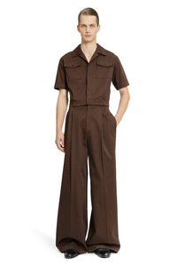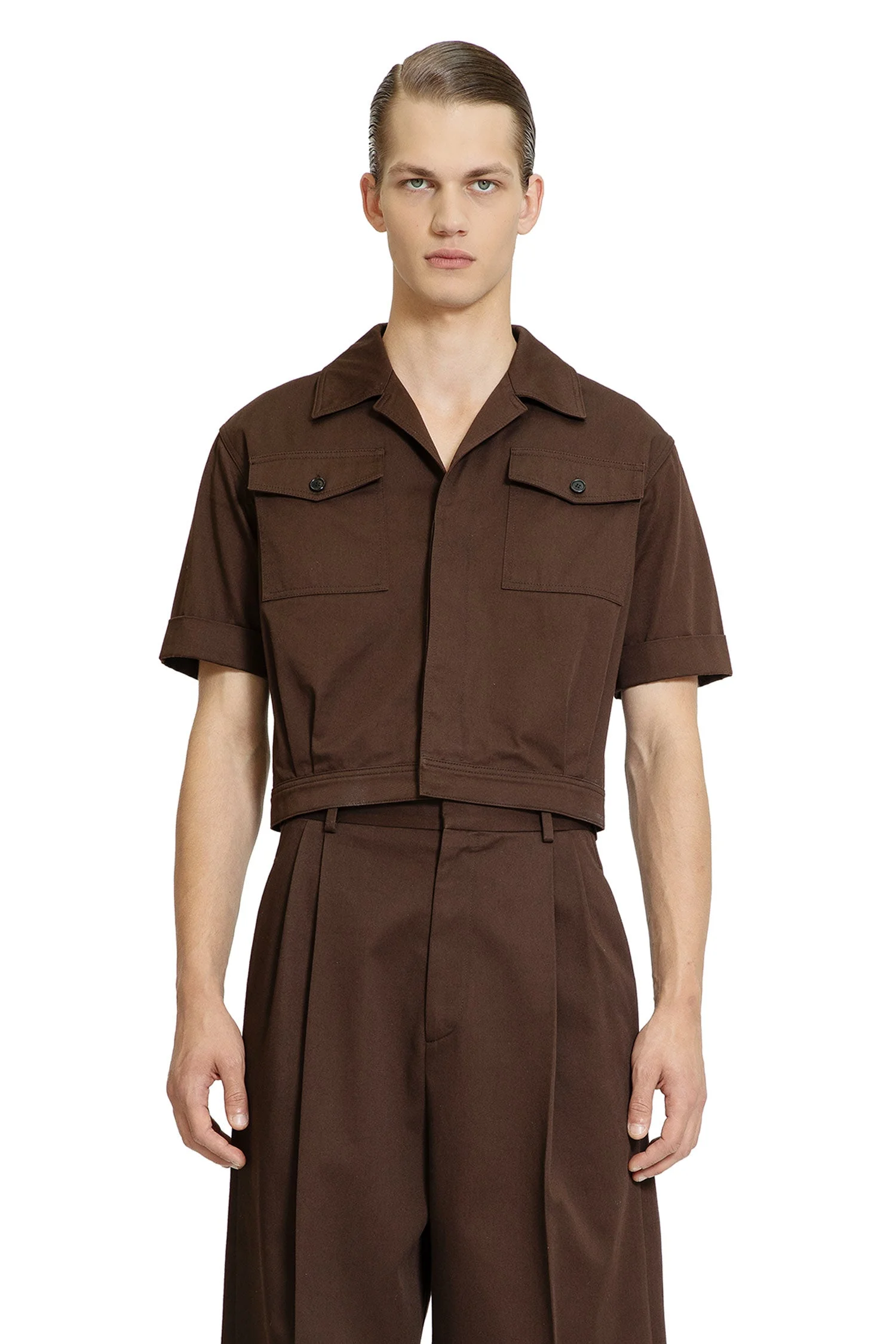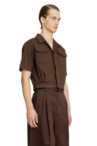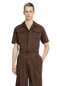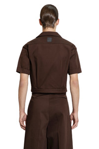 DESCRIPTION - Chocolate brown - Cotton canvas - Notched collar - Button closure - Dropped shoulders - Short sleeves - Turn-up cuffs - Back anagram calfskin patch - Gathered waist - Cropped hem - Boxy fit DETAILS - Made in: Italy - Composition: 100% Cotton - Model code: H526Y05WCV 3270 - Item ID: 9837569835350