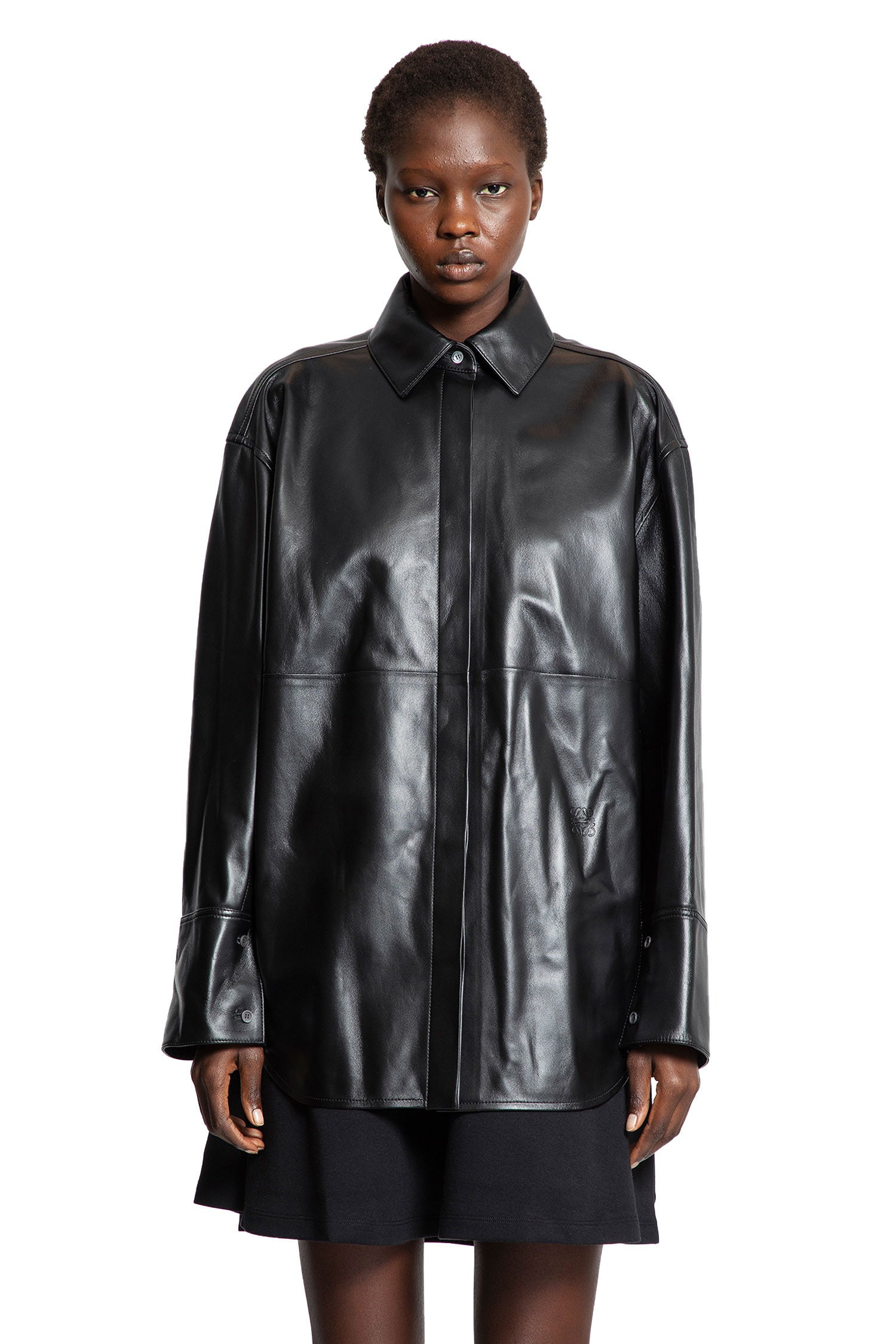 DESCRIPTION - Black - Lightweight nappa lambskin - Classic collar - Concealed button closure - Dropped shoulders - Long sleeves - Buttoned cuffs - Back anagram embroidery - Back box pleat - Unlined - Relaxed fit - Fit can be adjusted with buttoned sides and sleeves DETAILS - Made in: Italy - Composition: 100% Lambskin - Model code: S359Y31L35 1100 - Item ID: 9729917649238 SIZE & FIT Model wears size 36 Model Height 180 cm Bust 77 cm Waist 57 cm Hips 97 cm