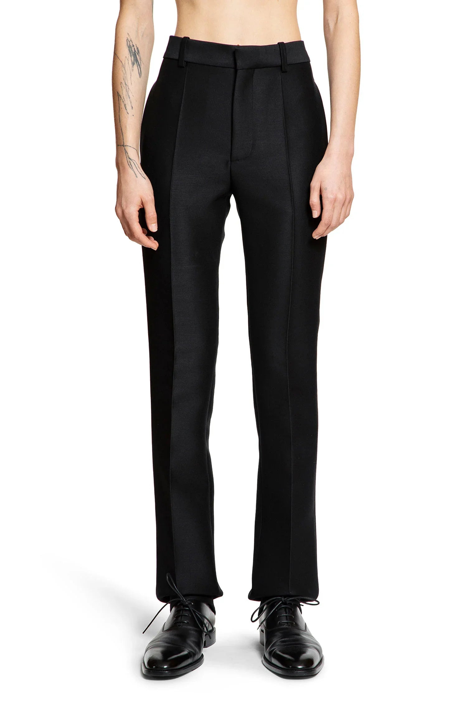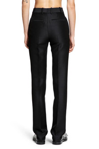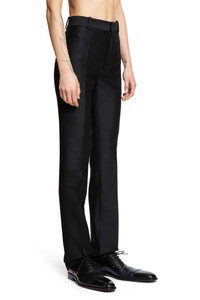 DESCRIPTION - Runway style - Black - Wool silk twill - High-waisted - Leg crease - Belt holes - Hook and zip closure - Side pockets - Back pockets - Slim fit DETAILS - Made in: Italy - Composition: 70% Wool 30% Silk - Model code: S540Y04XLL 1100 - Item ID: 9404217819478