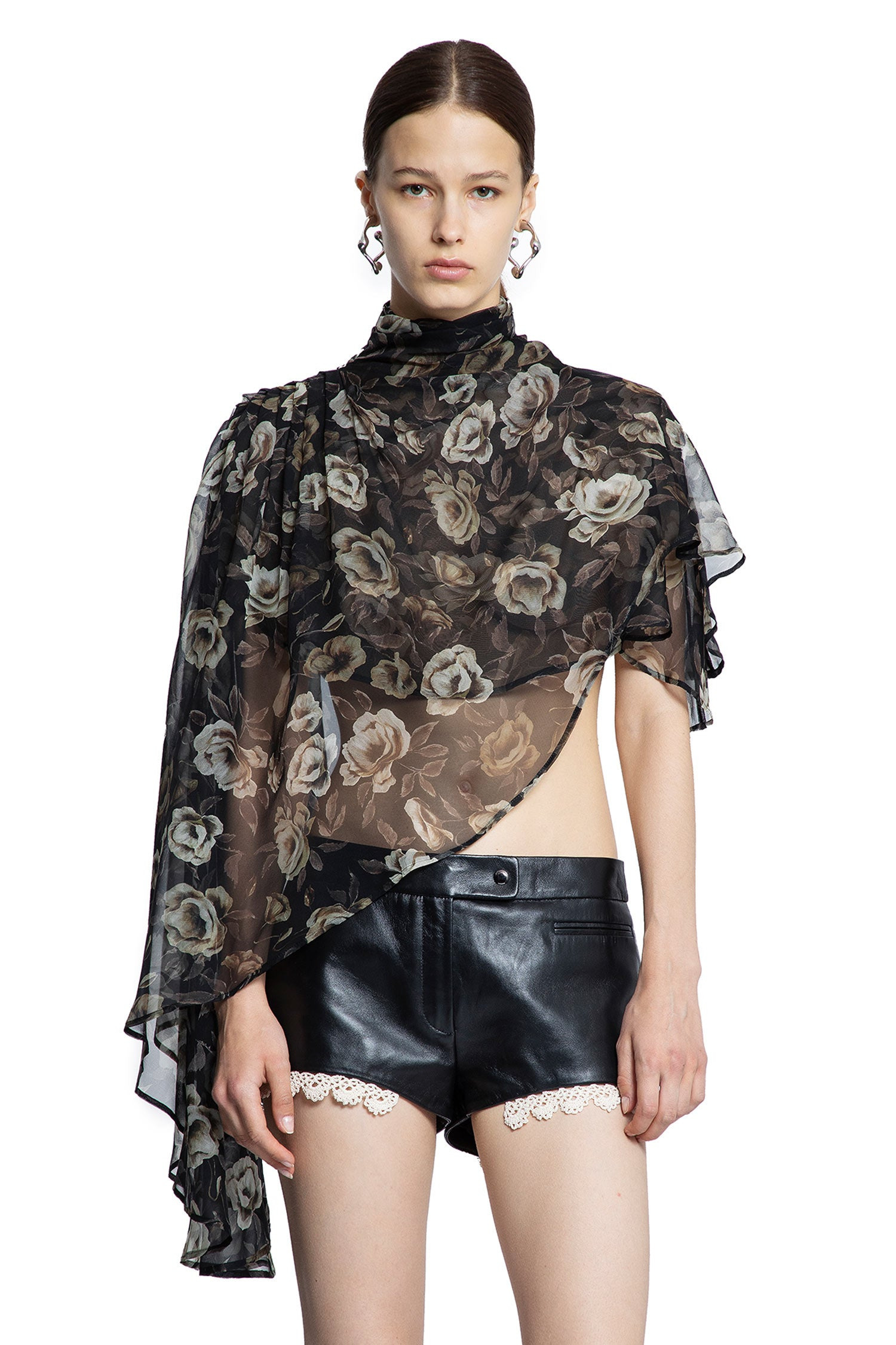 DESCRIPTION - Black - Floral print - Flowing sheer silk - High-neck - Back teardrop button closure - Asymmetric hem - Cropped fit - Draped DETAILS - Made in: Italy - Composition: 100% Silk - Model code: 203725 BLACK - Item ID: 9741278249302