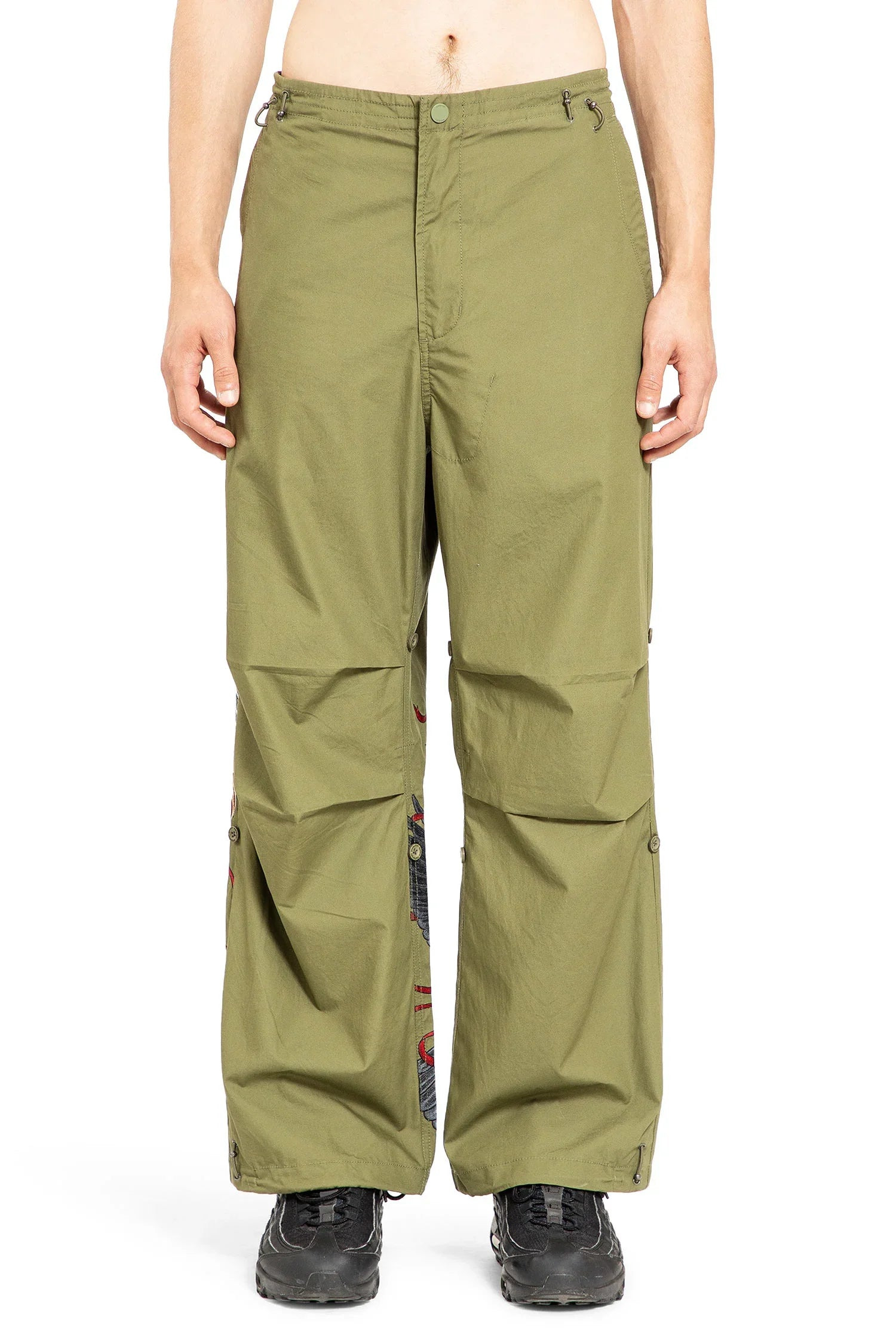 DESCRIPTION - Olive - Cotton canvas - Drawstring waist - Press stud and zip closure - Slouched knees - Back Crow and Heron embroidery - Drawstring hems - Loose fit - Straight leg - Snopants - The length and the fit of the waist and hems can be adjusted thank tonthe Snobutton system. DETAILS - Made in: India - Composition: 100% Cotton - Model code: 6102 OLIVE - Item ID: 9458502205782 SIZE & FIT Model wears size M Model Height 187 cm Chest 87 cm Waist 69 cm Hips 91 cm