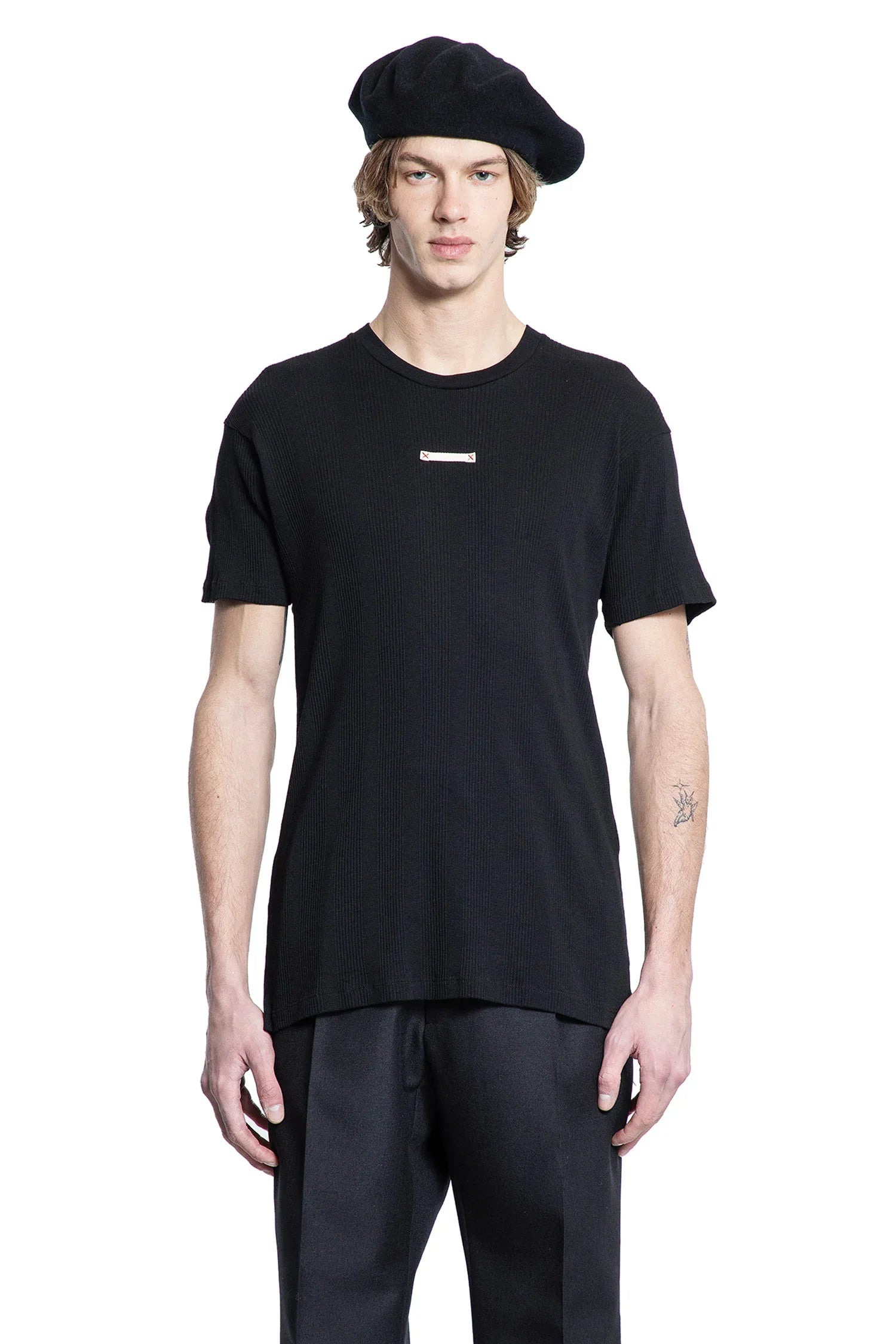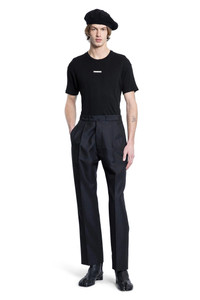 DESCRIPTION - Black - Ribbed cotton lyocell jersey - Round neck - Chest stitched tailoring label - Dropped shoulders - Short sleeves - Back stitch moniker - Slim fit DETAILS - Made in: Italy - Composition: 60% Cotton 40% Lyocell - Model code: S50GC0712M20060 900 - Item ID: 9432854823254 SIZE & FIT Model wears size S Model Height 188 cm Chest 88 cm Waist 69 cm Hips 88 cm