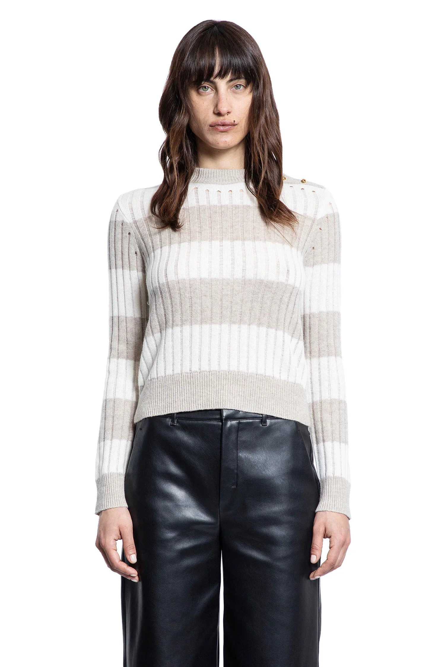 DESCRIPTION - Multicolor - White/beige - Wool cashmere notched ribbed-knit - Crewneck - Buttoned shoulder - Cropped hem - Ribbed hem and cuffs - Slim fit DETAILS - Made in: Italy - Composition: 70% Wool 30% Cashmere - Model code: 2511361111600 020 - Item ID: 9398872768854 SIZE & FIT Model wears size S Model Height 175 cm Bust 82 cm Waist 68 cm Hips 93 cm