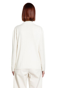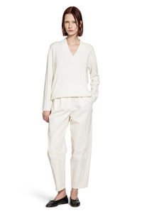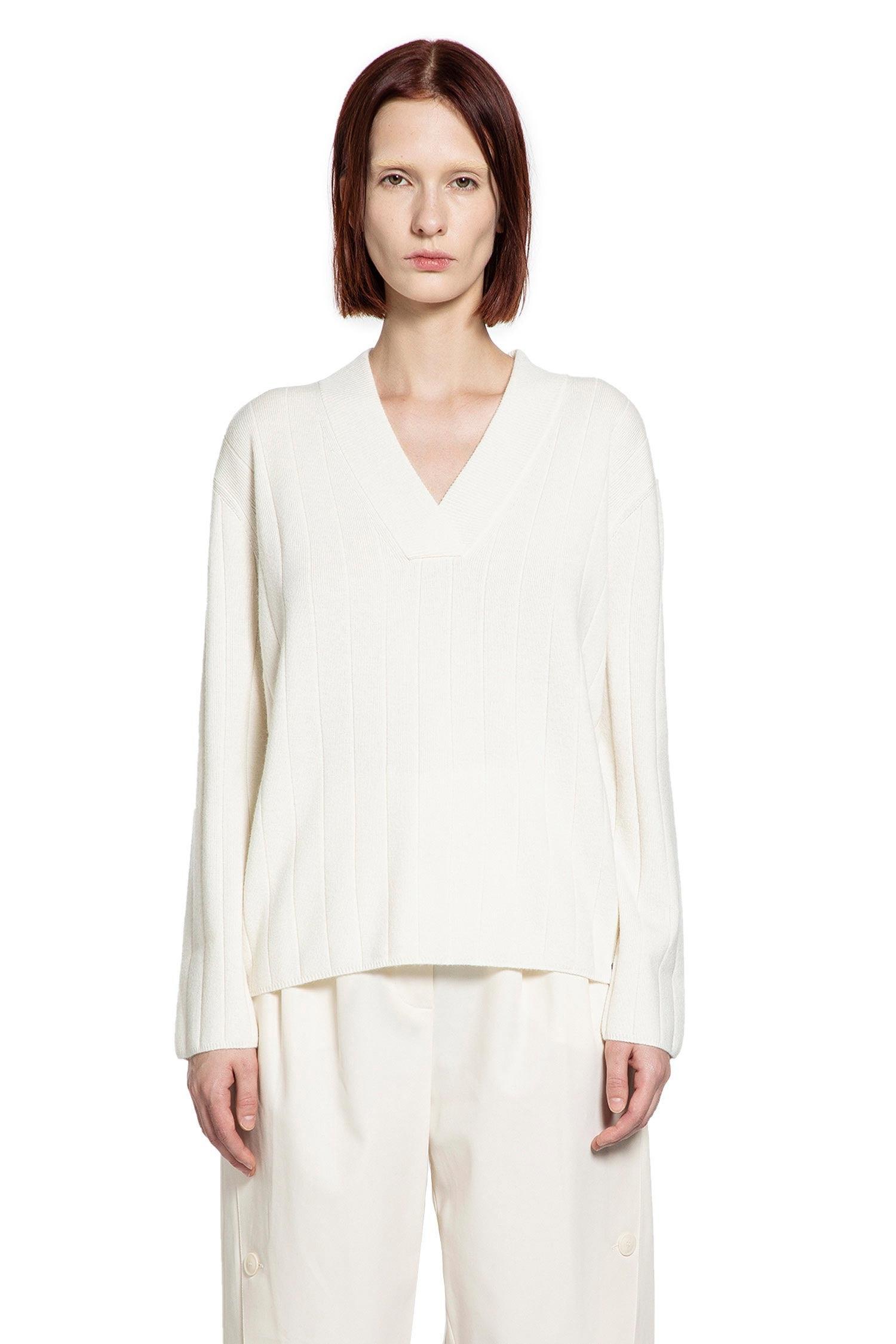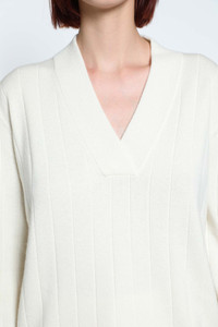 DESCRIPTION - White - Ribbed cashmere knit - V-neck - Dropped shoulders - Front logo tag - Ribbed hem and cuffs - Relaxed fit DETAILS - Made in: Italy - Composition: 100% Cashmere - Model code: 2521366059600 003 - Item ID: 9768002584918