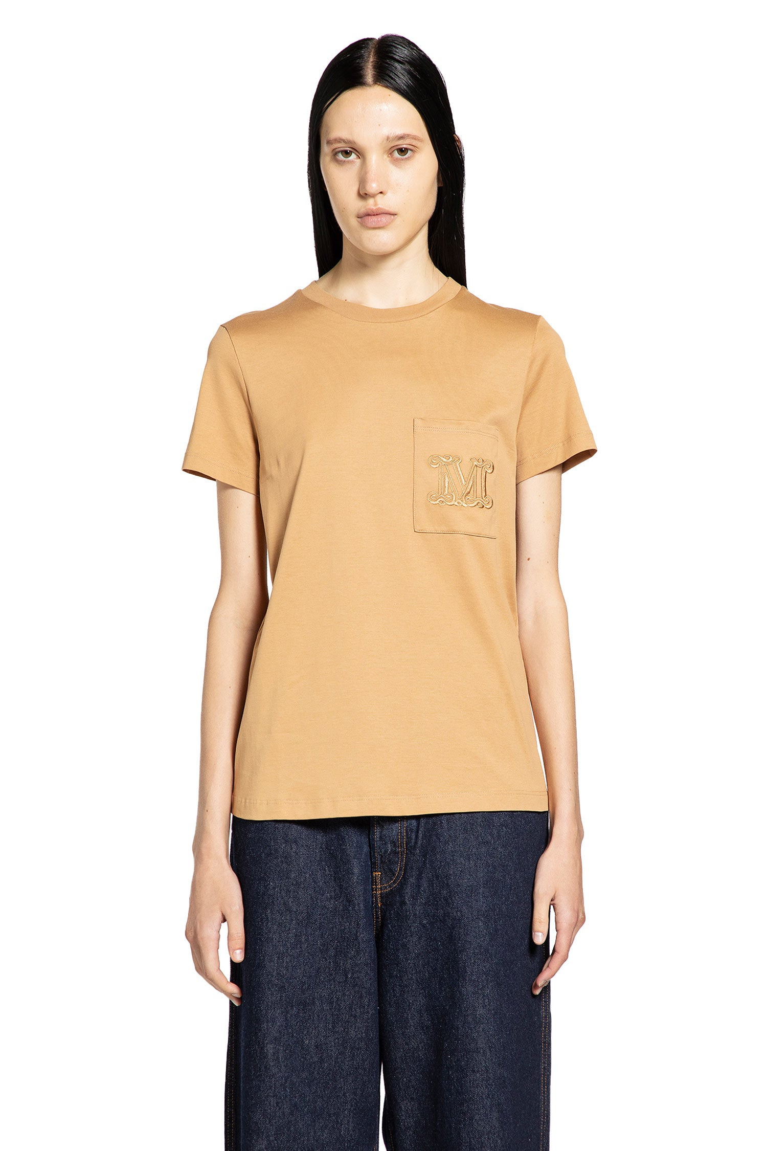 DESCRIPTION - Camel - Cotton jersey - Round neck - Chest monogram embroidery - Chest pocket - Dropped shoulders - Short sleeves - Straight cut - Regular fit DETAILS - Made in: Tunisia - Composition: 100% Cotton - Model code: 2521946041600 003 - Item ID: 9828515447126 SIZE & FIT Model wears size S Model Height 177 cm Bust 76 cm Waist 58 cm Hips 86 cm