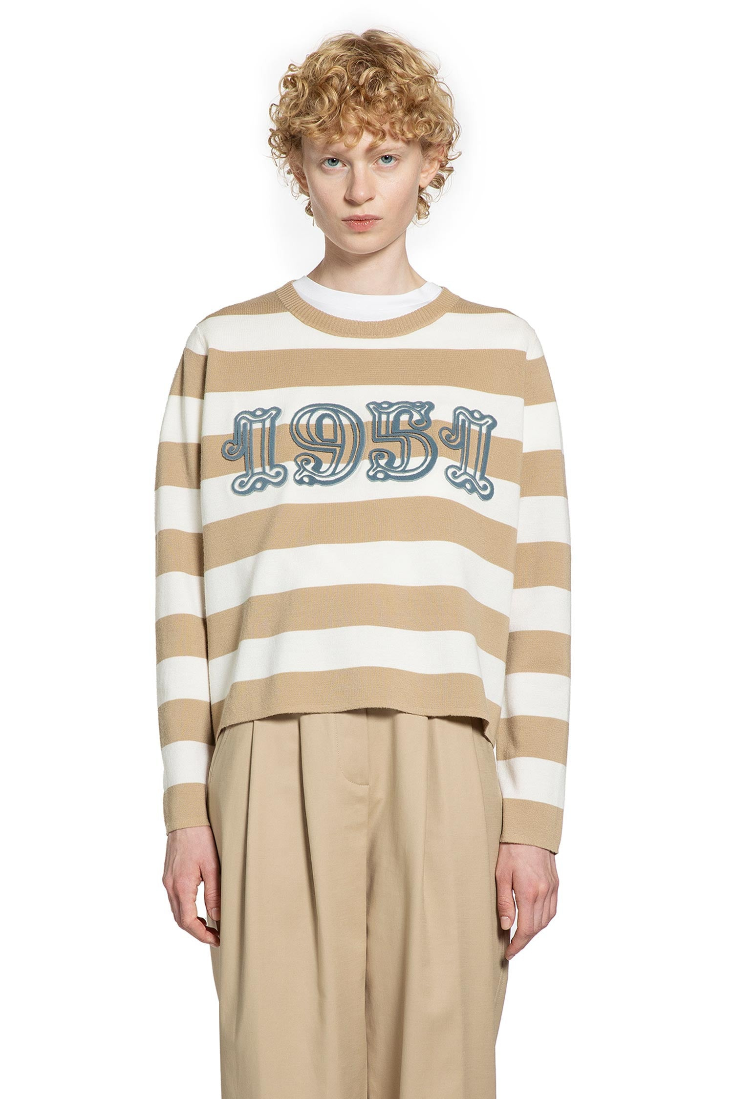 DESCRIPTION - Multicolor - Sand/white - Striped wool knit - Crewneck - Front flocked 1951 - Dropped shoulders - Ribbed hem and cuffs - Boxy fit DETAILS - Made in: Italy - Composition: 100% Virgin Wool - Model code: 2521366091600 008 - Item ID: 9824070631766 SIZE & FIT Model wears size S Model Height 180 cm Bust 82 cm Waist 58 cm Hips 90 cm
