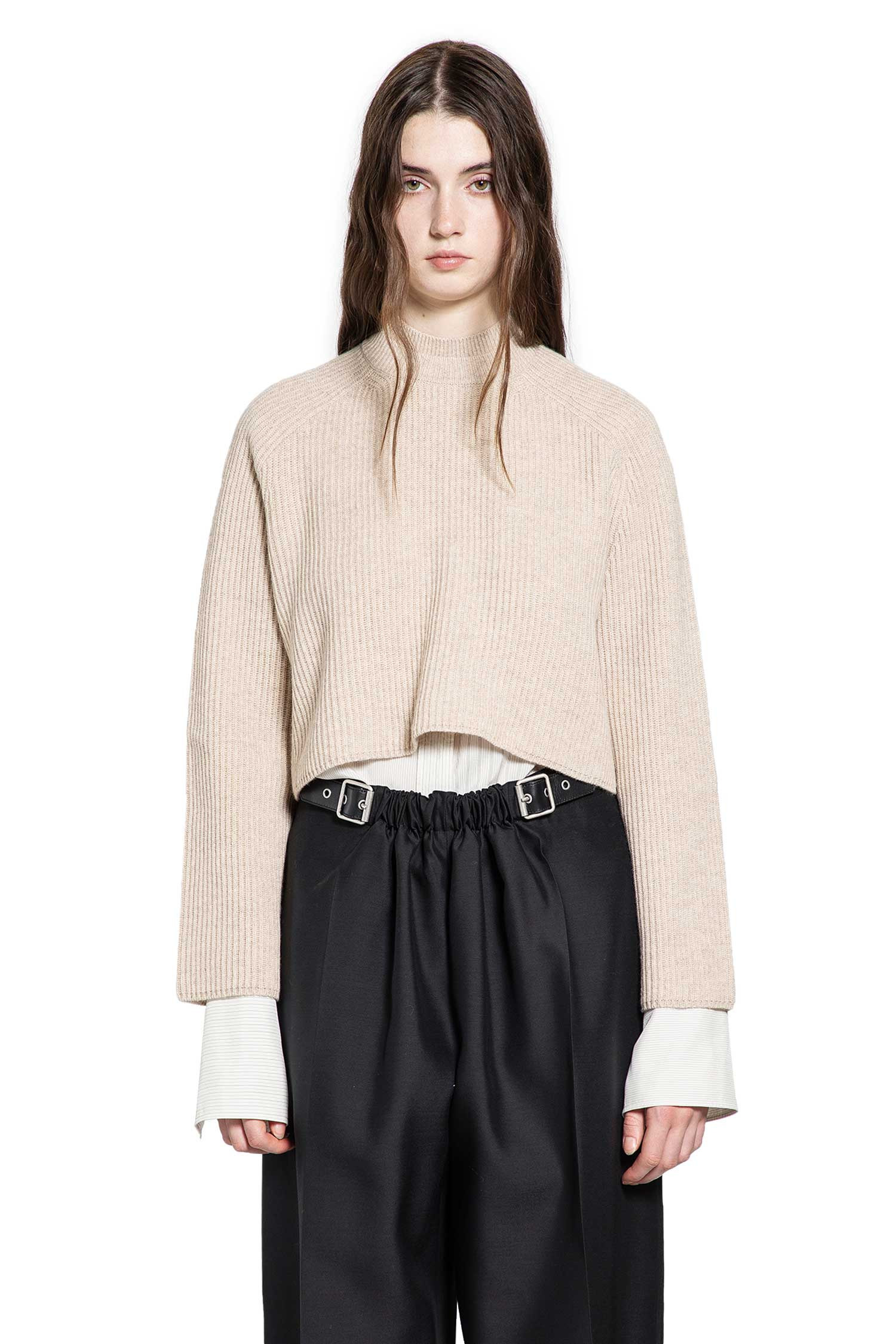 DESCRIPTION - Beige - Fisherman s rib knit - Layered crewneck - Raglan sleeves - Back logo plate - Cropped hem - Boxy fit DETAILS - Made in: Italy - Composition: 70% Wool 30% Cashmere - Model code: 2521366172600 004 - Item ID: 9875658867030