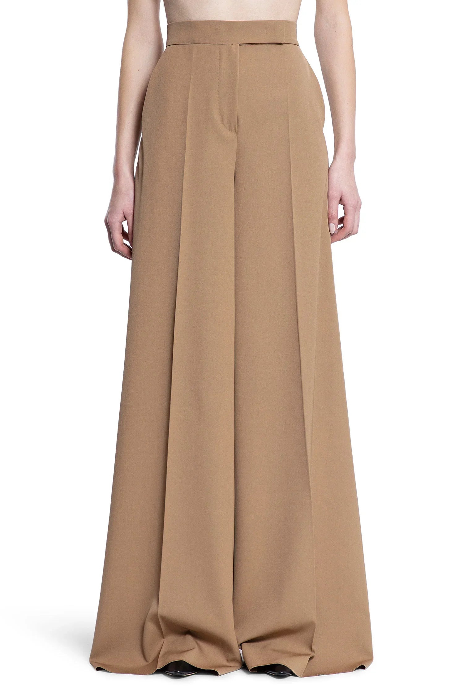 DESCRIPTION - Camel - Pure wool gabardine - High-waisted - Hook and zip closure - Leg crease - Front pleats - Side pockets - Wide leg - Floor length DETAILS - Made in: Italy - Composition: 100% Virgin Wool - Model code: 2511131011600 003 - Item ID: 9337808257366 SIZE & FIT Model wears size 38 Model Height 178 cm Bust 85 cm Waist 73 cm Hips 92 cm