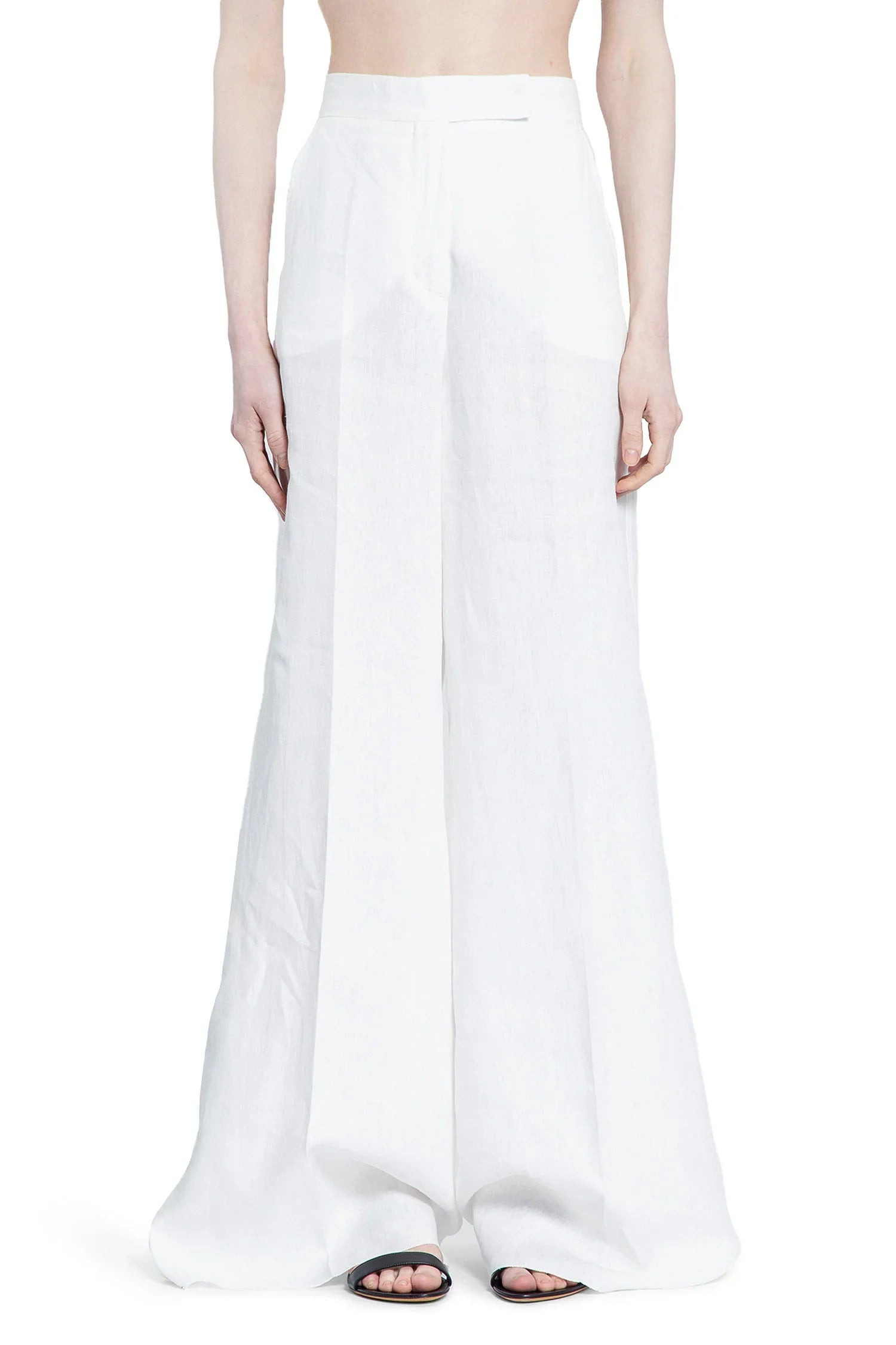 DESCRIPTION - White - Linen canvas - Slightly high-waisted - Hook and zip closure - Leg crease - Side pockets - Wide leg - Floor length DETAILS - Made in: Italy - Composition: 100% Linen - Model code: 2511131092600 005 - Item ID: 9498215579990 SIZE & FIT Model wears size 38 Model Height 180 cm Chest 82 cm Waist 58 cm Hips 90 cm