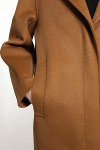 DESCRIPTION - In the Fall Winter 2025 collection, the Masculine Cashmere Coat in camel embodies timeless sophistication and artisanal precision. Crafted from matte double-faced pure cashmere with hand-stitched details, it features a notched collar with leather undercollar and a concealed button closure. Side pockets, dropped shoulders, and a straight hem enhance its effortless structure, while the slight cocoon fit expresses minimalist menswear elegance. DETAILS - Made in: Italy - Composition: 100% Cashmere - Model code: 2521016125600 028 - Item ID: 9896773779798 SIZE & FIT Garment length 105 cm
