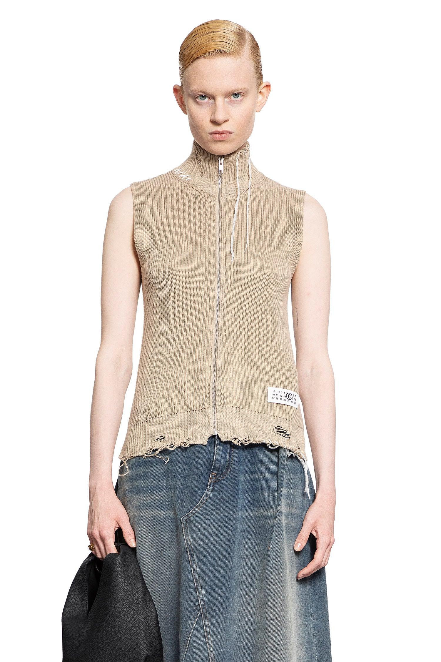 DESCRIPTION - Beige - Destroyed cotton knit - High-neck - Zip closure - Front numeric logo label - Sleeveless - Back stitch moniker - Ribbed hem - Fitted DETAILS - Made in: Italy - Composition: 100% Cotton - Model code: S52FB0095M13089 119 - Item ID: 9273472319830