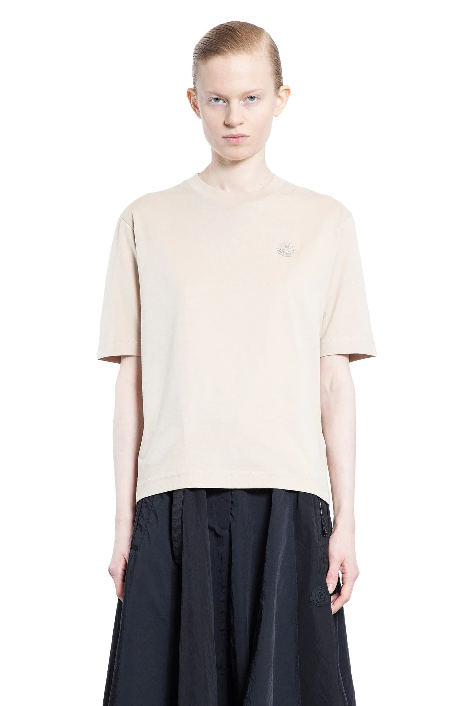 DESCRIPTION - Beige - Cotton jersey - Round neck - Chest rubber logo patch - Dropped shoulders - Short sleeves - Regular fit DETAILS - Made in: Turkey - Composition: 100% Cotton - Model code: 8C0000589A17 21E - Item ID: 9403748680022 SIZE & FIT Model wears size S Model Height 180 cm Bust 82 cm Waist 61 cm Hips 86 cm