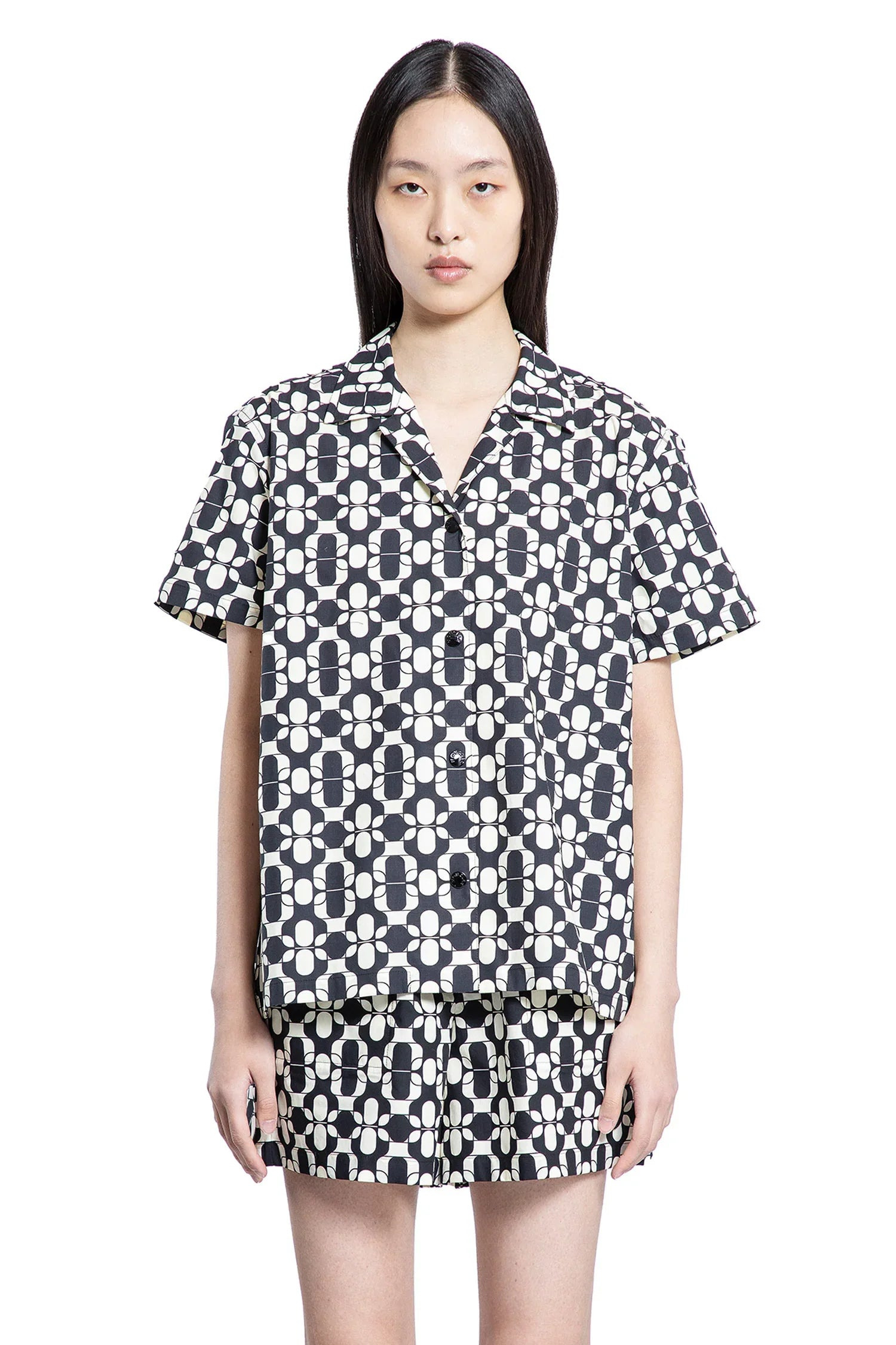 DESCRIPTION - Black/white - Seasonal print - Notched collar - Button closure - Dropped shoulders - Short sleeves - Boxy fit DETAILS - Made in: Italy - Composition: 100% Cotton - Model code: 2F00018598H6 F09 - Item ID: 9502210785622 SIZE & FIT Model wears size 1 Model Height 177 cm Bust 76 cm Waist 63cm Hips 89 cm
