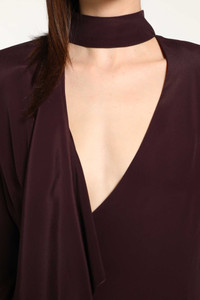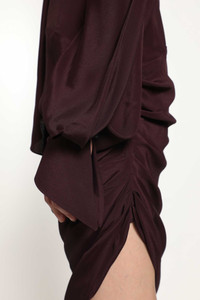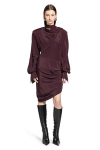 DESCRIPTION - In the Fall Winter 2025 collection, the Draped Scarf Dress in burgundy exudes fluid sophistication and modern femininity. Crafted from matte crepe-silk blend, it features a convertible draped scarf collar, straight padded shoulders, and a refined V-neck. The long sleeves with buttoned cuffs and an asymmetric draped hem create a graceful silhouette that blends architectural structure with soft movement. DETAILS - Made in: Portugal - Composition: 73% Acetate 27% Silk - Model code: 25F1RO1759385 3402 - Item ID: 9896775844182