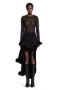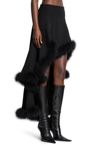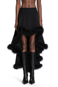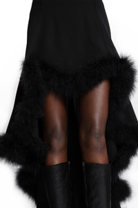 DESCRIPTION - Black - Wool twill - Marabou feather trim - Cascading hem - Back concealed zip closure - Asymmetric style DETAILS - Made in: Bulgaria - Composition: 78% Viscose 22% Virgin Wool - Model code: 25F1JU0575196 1999 - Item ID: 9741112312150 SIZE & FIT Model wears size 36 Model Height 177 cm Bust 74 cm Waist 58 cm Hips 85 cm