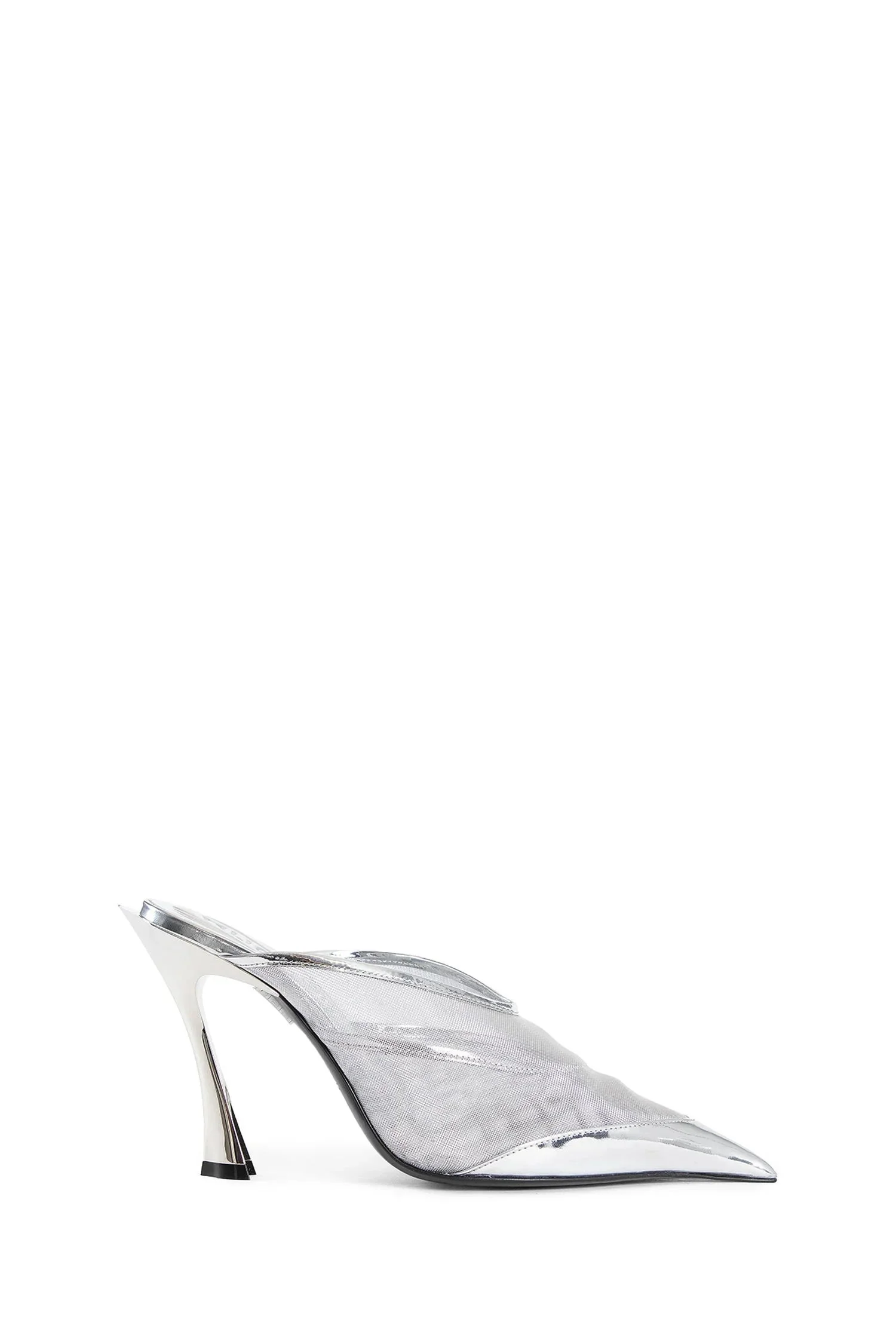 DESCRIPTION - Silver - Mesh and mirror leather - Leather trim - Ponted toe - Fang stiletto heel - Rubber sole DETAILS - Made in: Italy - Composition: 70% Polyester 30% Calfskin - Model code: MUWSS25SC010 SX015 - Item ID: 9459004932438