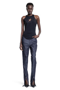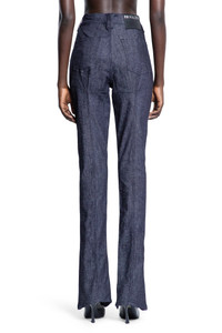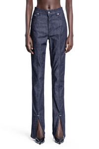 DESCRIPTION - Blue - Raw denim - High-waisted - Belt holes - Button and zip closure - 5 pockets - Back leather logo patch - Front hem splits with signature metal piercing - Floor length - Skinny fit DETAILS - Made in: Slovakia - Composition: 98% Cotton 2% Elastane - Model code: 25P6PA04962013 RD600 - Item ID: 9426106646870 SIZE & FIT Model wears size 30 Model Height 177 cm Bust 74 cm Waist 58 cm Hips 85 cm