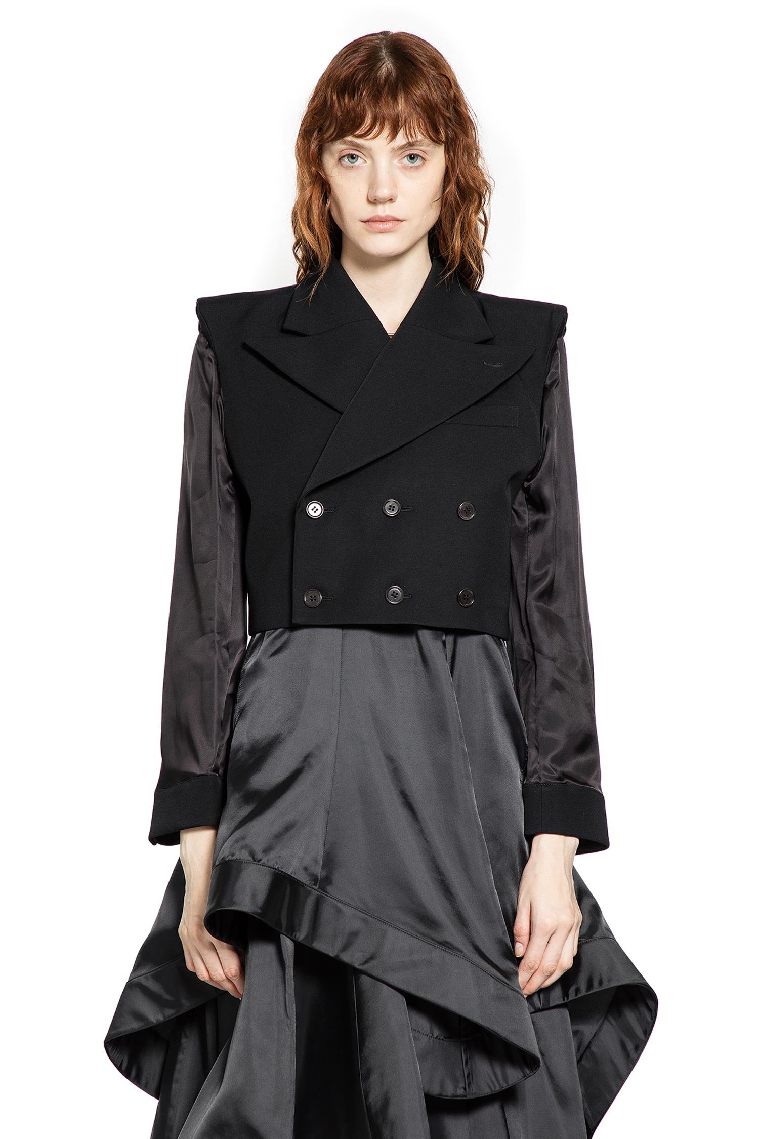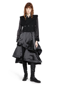 DESCRIPTION - Runway style - Black - Wool twill - Peak lapels - Padded shoulders - Triple-breasted - Button closure - Chest pocket - Cropped hem - Straight fit DETAILS - Made in: Japan - Composition: 100% Wool - Model code: 3PJ008W25 1 - Item ID: 9799786070358
