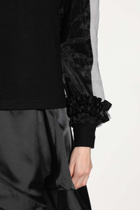 DESCRIPTION - Runway style - Black - Wool jersey and sheer nylon tulle - Round neck - Long layered crinkled sheer tulle and wool - Jersey sleeves - Ribbed cuffs with frilled trim - Slim fit DETAILS - Made in: Japan - Composition: 100% Wool 100% Polyester - Model code: 3PT006W25 1 - Item ID: 9799786529110