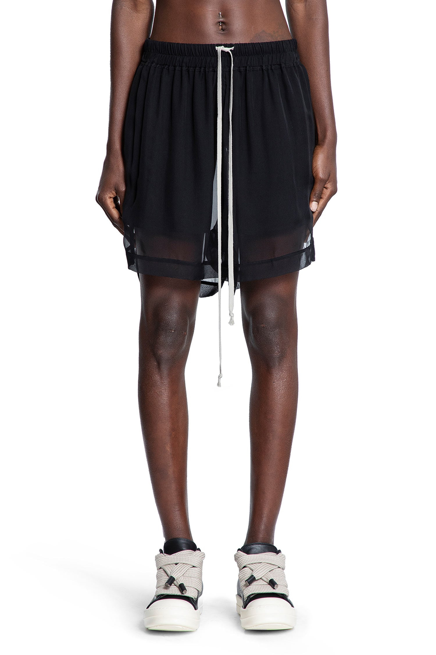 DESCRIPTION - Black - Semi-sheer silk chiffon - Elastic waistband with drawstrings - Side pockets - Side splits - Slightly dropped crotch - Dropped back DETAILS - Made in: Italy - Composition: 100% Silk - Model code: RP02E4380S 09 - Item ID: 9668720460118 SIZE & FIT Model wears size 44 Model Height 176 cm Bust 77 cm Waist 60 cm Hips 87 cm
