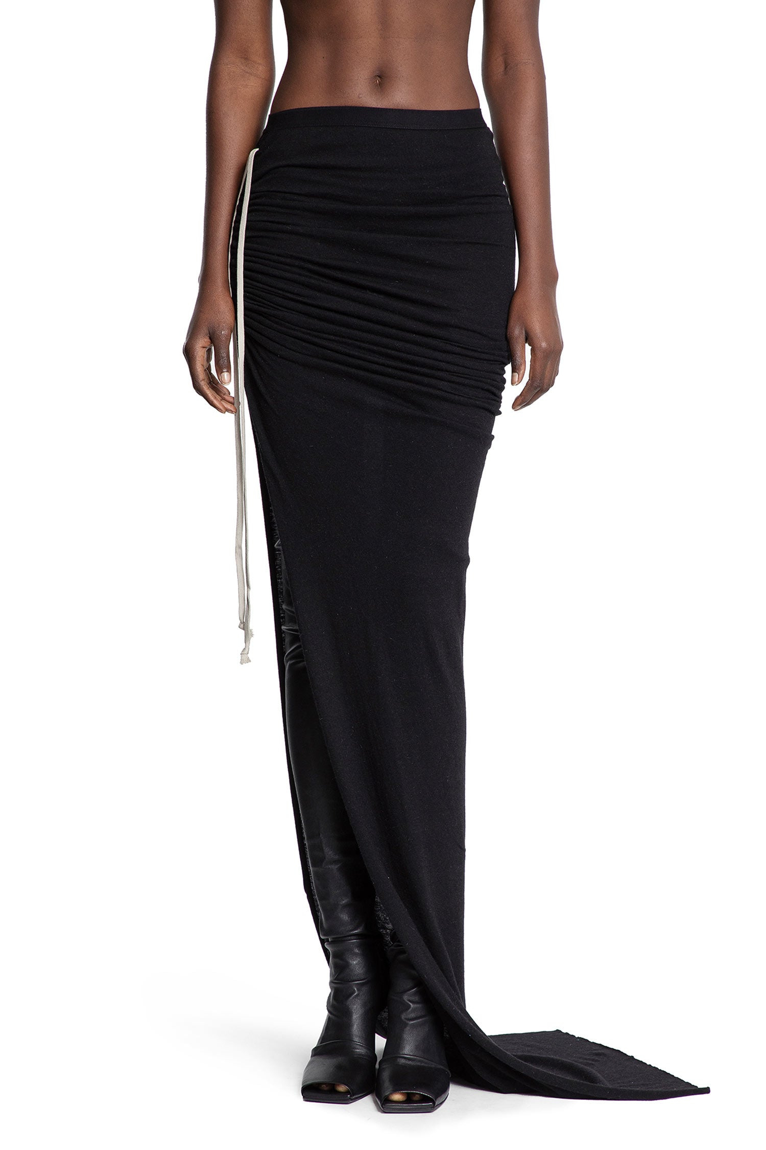DESCRIPTION - Black - Classic cotton jersey - High-waisted - Elastic waistband - Side ruched gathering - Side split - Long trail panel - Floor length - Draped DETAILS - Made in: Italy - Composition: 100% Cotton - Model code: RP02E4359JR 09 - Item ID: 9679332639062 SIZE & FIT Model wears size 38 Model Height 180 cm Bust 77 cm Waist 57 cm Hips 87 cm