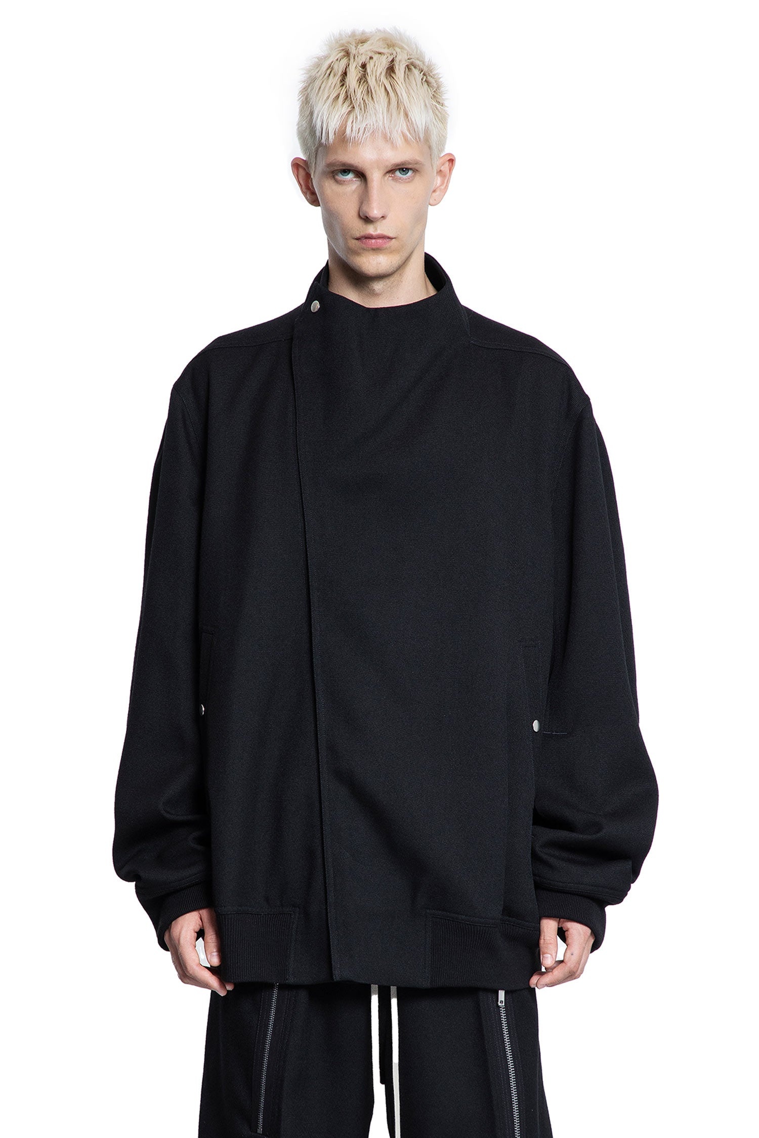 DESCRIPTION - Black - Press stud collar - Asymmetric concealed zip closure - Press stud side poockets - Dropped shoulders - Back press stud details - Ribbed hem and cuffs DETAILS - Made in: Italy - Composition: 100% Wool - Model code: RU02E1760WD 09 - Item ID: 9677928890710 SIZE & FIT Model wears size 52 Model Height 186 cm Chest 89 cm Waist 72 cm Hips 90 cm