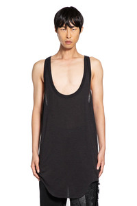 DESCRIPTION - Runway style - Black - Silk wool jersey - Low scoop neck - Sleeveless - Racer back - Back signature stitching - Elongated curved raw-edge hem - Slim fit DETAILS - Made in: Italy - Composition: 70% Wool 30% Silk - Model code: RR02E1101JSW 09 - Item ID: 9795891167574 SIZE & FIT Model wears size S Model Height 188 cm Chest 88 cm Waist 69 cm Hips 88 cm