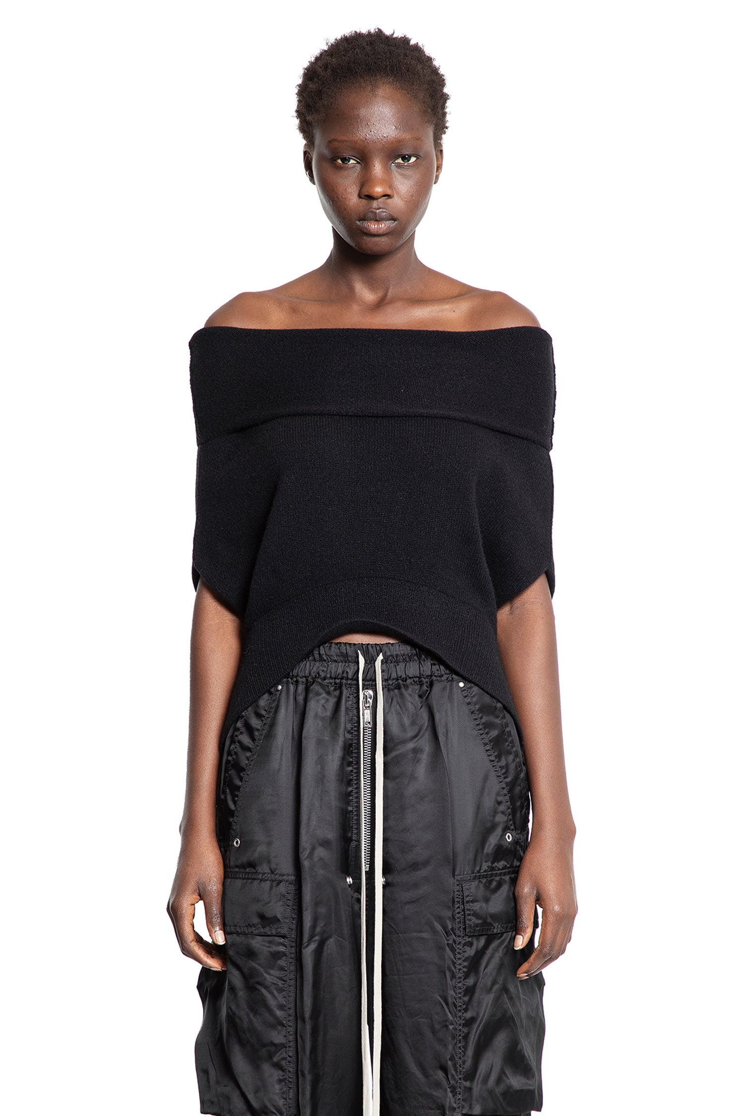 DESCRIPTION - Black - Recycled cashmere knit - Folded off-the shoulders neckline - Short sleeves - Back signature knit line - Ribbed hem - Asymmetric hem - Fitted DETAILS - Made in: Italy - Composition: 97% Cashmere 3% Wool - Model code: RP02E4681WSBR 09 - Item ID: 9679333294422 SIZE & FIT Model wears size S Model Height 180 cm Bust 77 cm Waist 57 cm Hips 87 cm