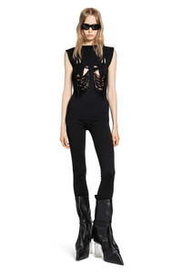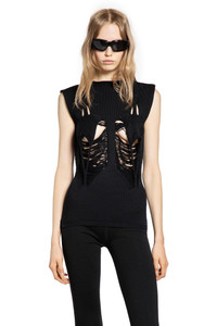 DESCRIPTION - Runway style - Black - Wool knit - Rolled round neck - Shredded cut-out details - Short cap sleevs - Back signature knit line - Ribbed hem - Fitted DETAILS - Made in: Italy - Composition: 100% Wool - Model code: RO02E4664KWVHVP 09 - Item ID: 9926044221782