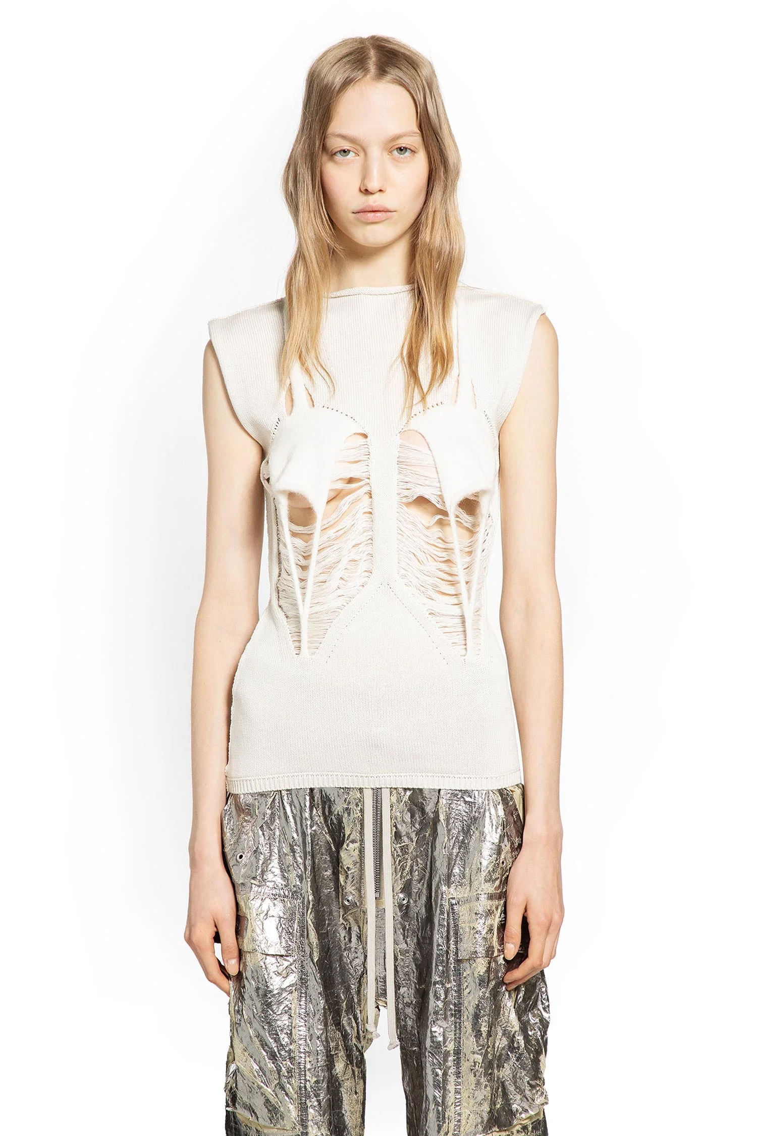 DESCRIPTION - Runway style - Milk white - Wool knit - Rolled round neck - Shredded cut-out details - Short cap sleevs - Back signature knit line - Ribbed hem - Fitted DETAILS - Made in: Italy - Composition: 100% Wool - Model code: RO02E4664KWVHVP 21 - Item ID: 9926044975446