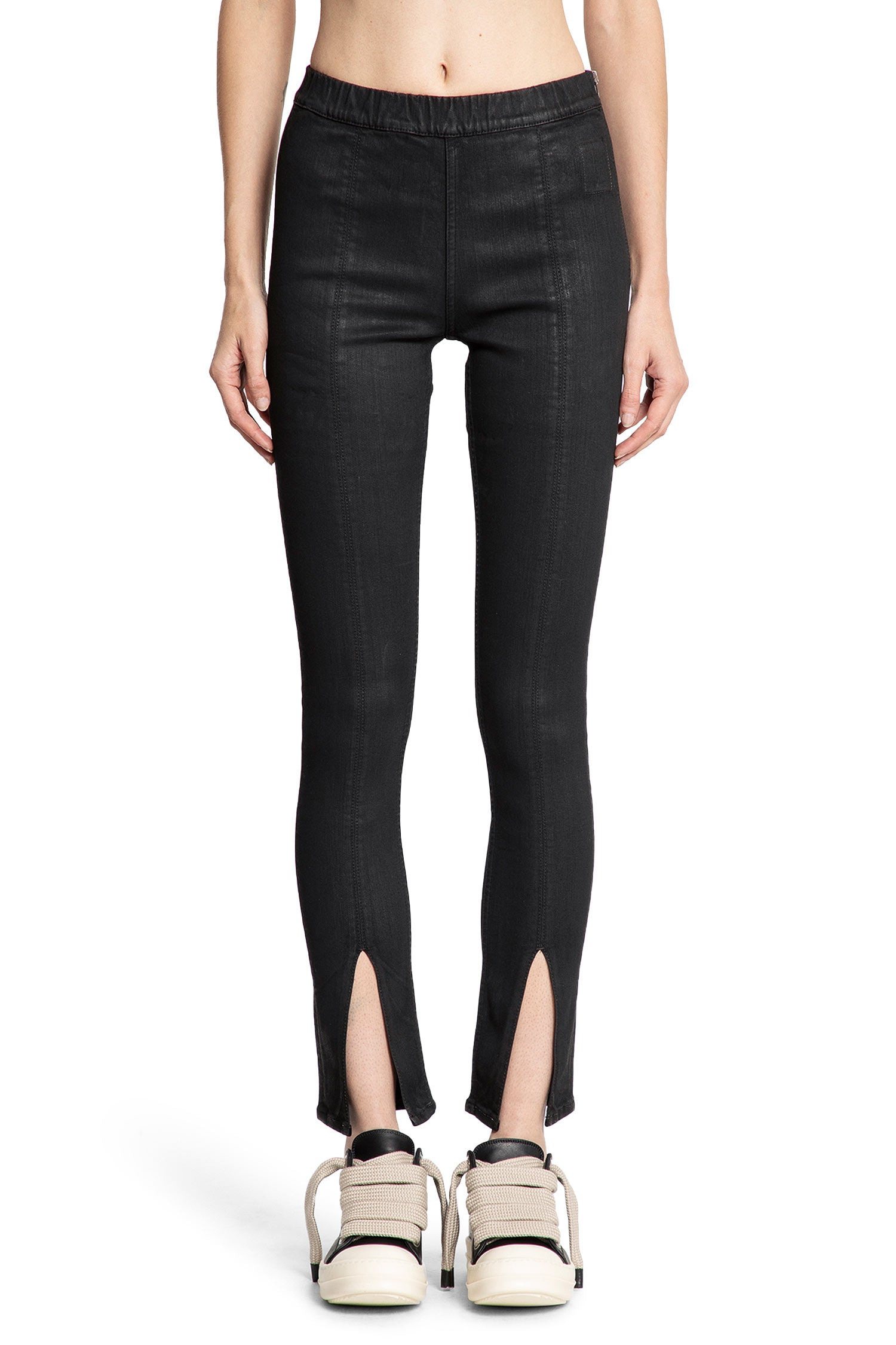 DESCRIPTION - Black - Wax stretch denim - Elastic waistband - Front signature seams - Side zip closure - Front hem splits - Fitted DETAILS - Made in: Italy - Composition: 91% Cotton 6% Elastomultiester 3% Rubber - Model code: DS02E7317SBW 99X - Item ID: 9719756456278 SIZE & FIT Model wears size S Model Height 180 cm Bust 80 cm Waist 59 cm Hips 89 cm
