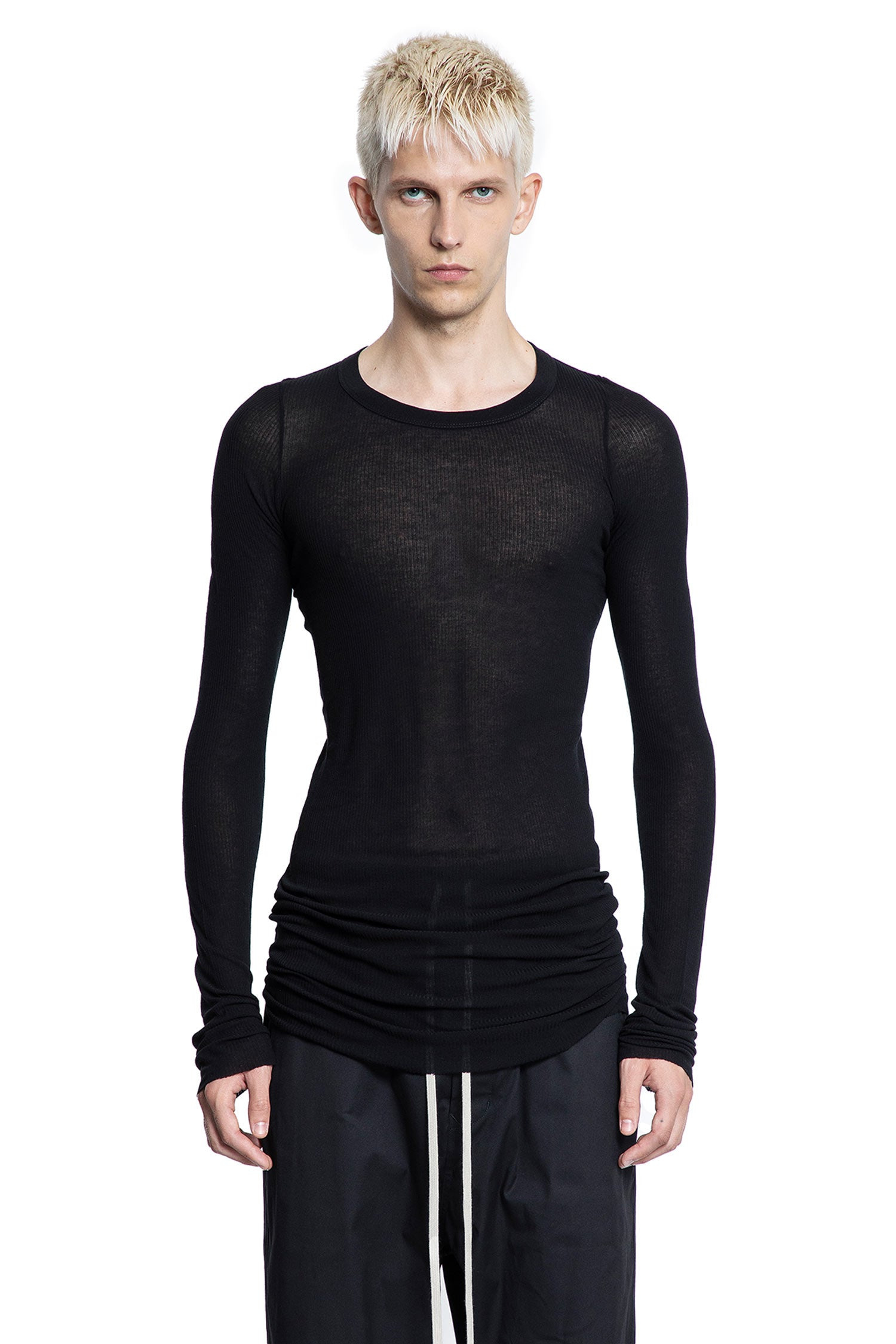 DESCRIPTION - Black - Mini rib jersey - Round neck - Long sleeves - Back signature seam - Raw-edge hem and cuffs - Slim fit DETAILS - Made in: Italy - Composition: 88% Viscose 12% Silk - Model code: RU02E1250RC 09 - Item ID: 9677929840982 SIZE & FIT Model wears size M Model Height 186 cm Chest 89 cm Waist 72 cm Hips 90 cm