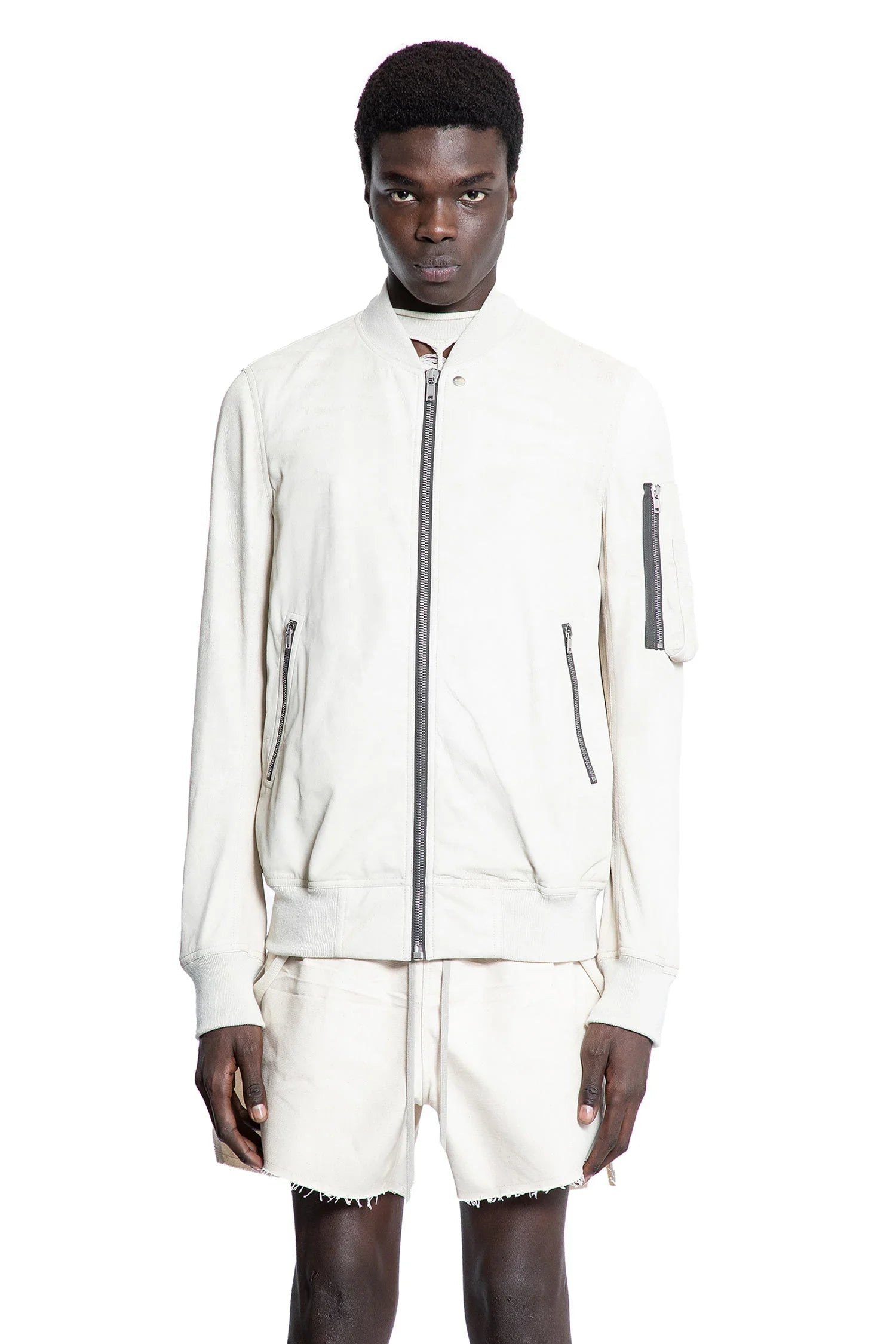 DESCRIPTION - Dinge - Blister lamb leather - Ribbed collar - Zip closure - Side zipped pockets - Sleeve zipped pocket - Back cotton webbing strap with rivets - Ribbed hem and cuffs DETAILS - Made in: Italy - Composition: 100% Lambskin - Model code: RU01E5778LBA 41 - Item ID: 9460286161238 SIZE & FIT Model wears size 48 Model Height 190 cm Chest 87 cm Waist 73 cm Hips 88 cm