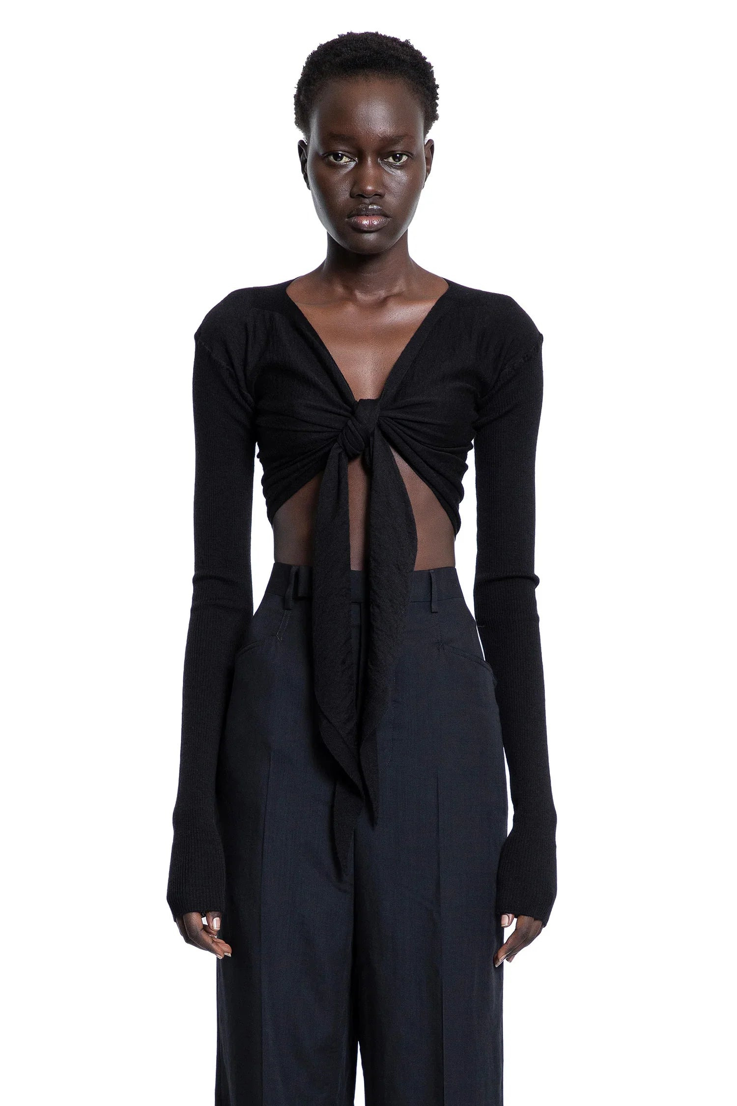 DESCRIPTION - Black - Lightweight rasato knit - V-neck - Front self-tie closure - Long sleeves - Back signature knit line - Cropped hem - Fitted DETAILS - Made in: Italy - Composition: 100% Wool - Model code: RP01E7645M 09 - Item ID: 9452825313622 SIZE & FIT Model wears size S Model Height 177 cm Bust 77 cm Waist 59 cm Hips 86 cm